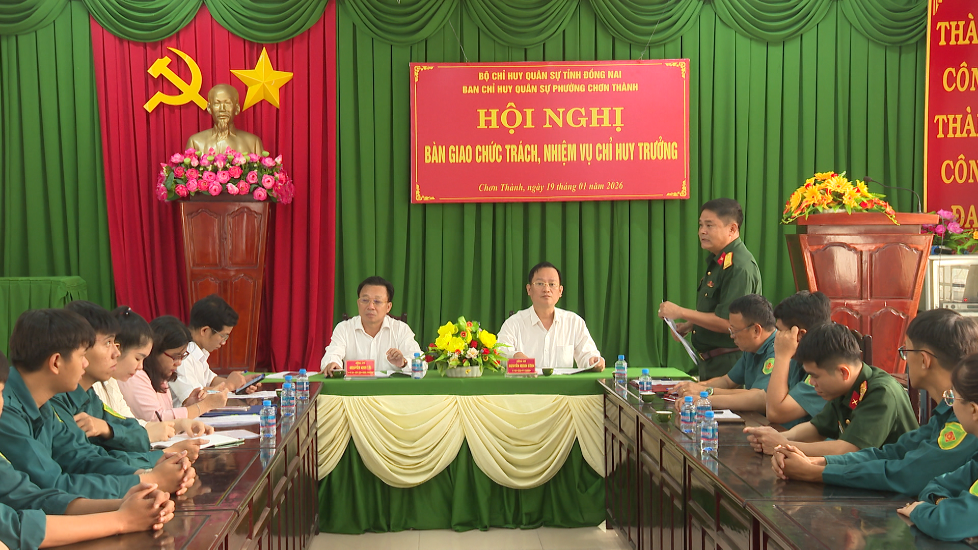 Đồng chí Nguyễn Minh Bình, Bí thư Đảng ủy phường Chơn Thành và đồng chí Nguyễn Anh Tài, Phó Bí thư Đảng ủy, Chủ tịch UBND phường Chơn Thành, chứng kiến nghi thức bàn giao chức trách, nhiệm vụ Chỉ huy trưởng Ban CHQS phường Chơn Thành