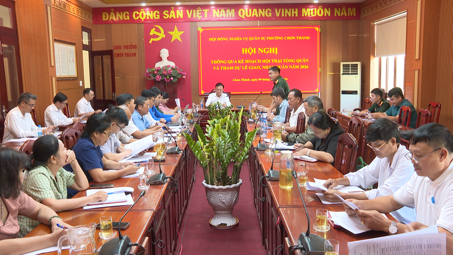 Tại cuộc họp lãnh đạo UBND phường Chơn Thành, đề nghị các cơ quan, ban, ngành, đoàn thể, Hội đồng nghĩa vụ quân sự phường và các khu phố cần phối hợp chặt chẽ, thực hiện tốt việc tổ chức Hội trại tòng quân năm 2026, với mục tiêu quan điểm: trang trọng, an toàn, tiết kiệm, đúng theo quy định. Hoàn thành xuất sắc công tác giao nhận quân, đạt 100% chỉ tiêu cấp trên giao.
