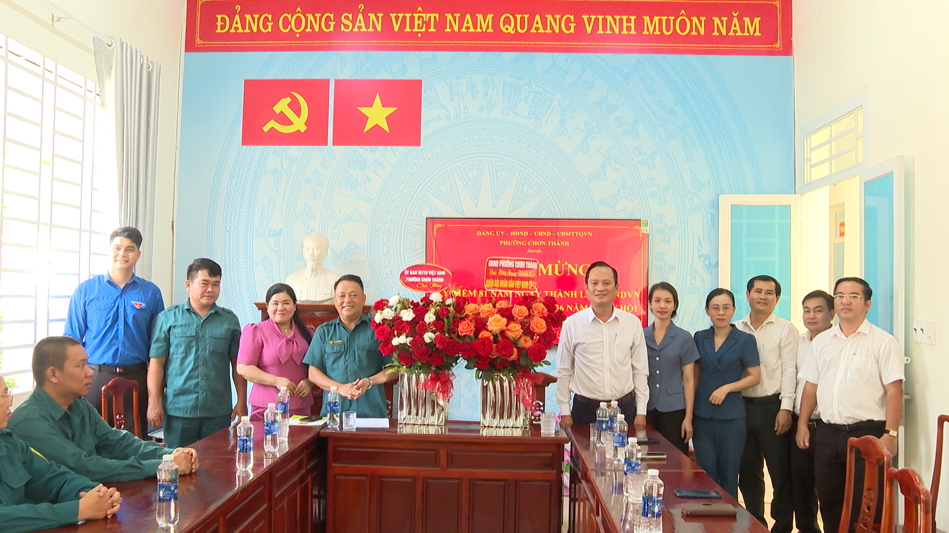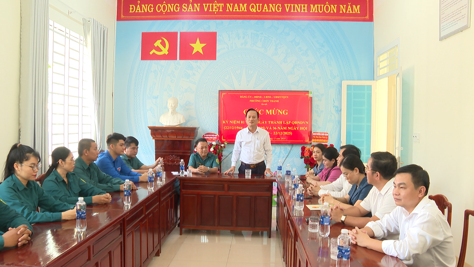 Lãnh đạo phường Chơn Thành, tặng hoa quà, chúc mừng cán bộ, chiến sỹ Ban Chỉ huy quân sự phường Chơn Thành, nhân dịp kỷ niệm 81 năm ngày thành lập Quân đội Nhân dân Việt Nam (22/12/1944 – 22/12/2025)