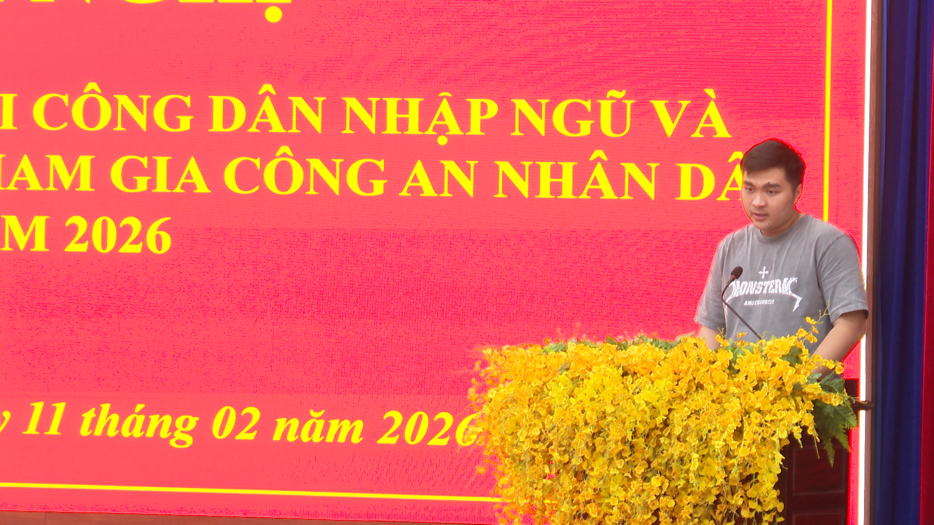 Đồng chí Trương Quang Vũ, khu phố 5, phường Chơn Thành đại diện cho các công dân nhập ngũ năm 2026, phát biểu xin hứa hoàn thành tốt nhiệm vụ được giao
