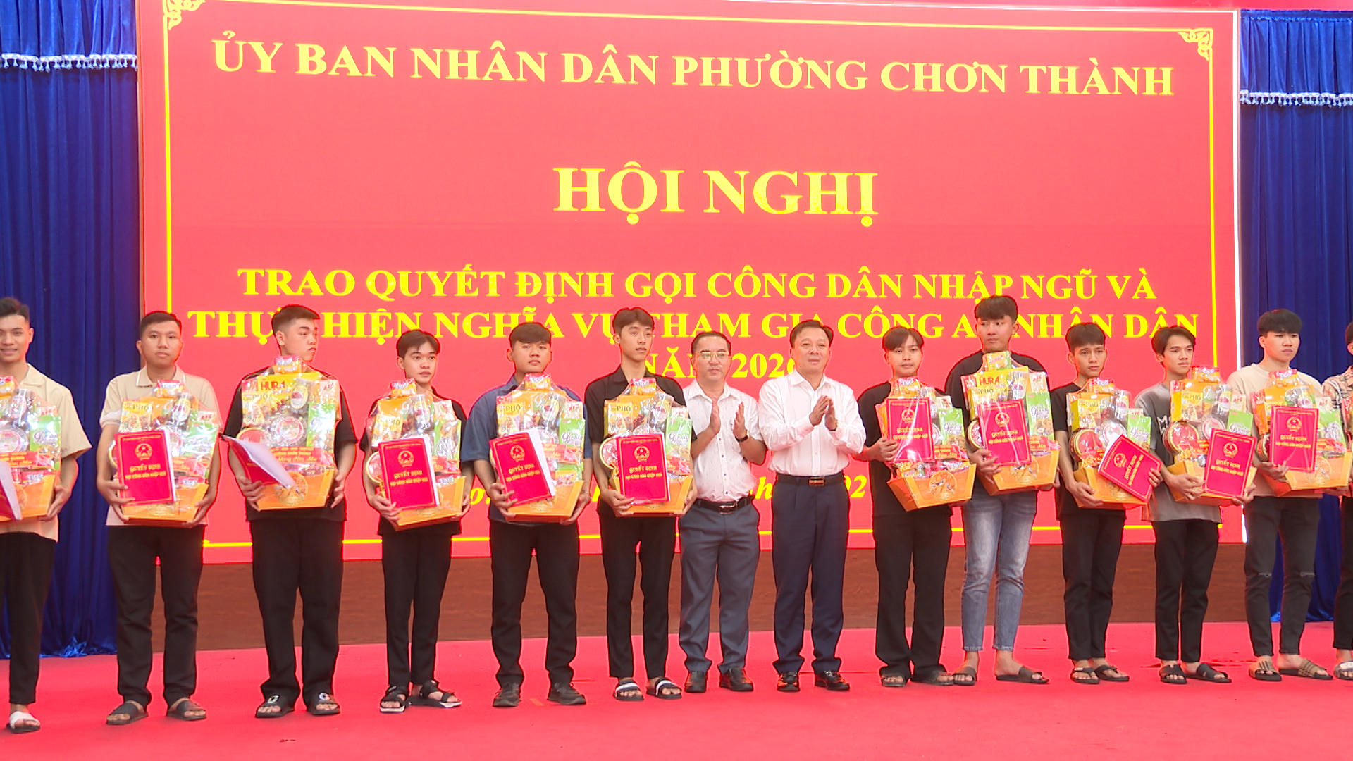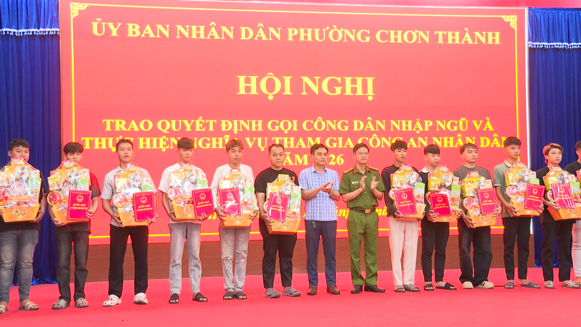 Đồng chí Nguyễn Anh Tài, Phó Bí thư Đảng ủy, Chủ tịch UBND phường, Chủ tịch HĐNVQS phường Chơn Thành, cùng các thành viên HĐNVQS phường, trao quyết định và tặng quà cho các công dân nhập ngũ và thực hiện nghĩa vụ tham gia Công an nhân dân năm 2026