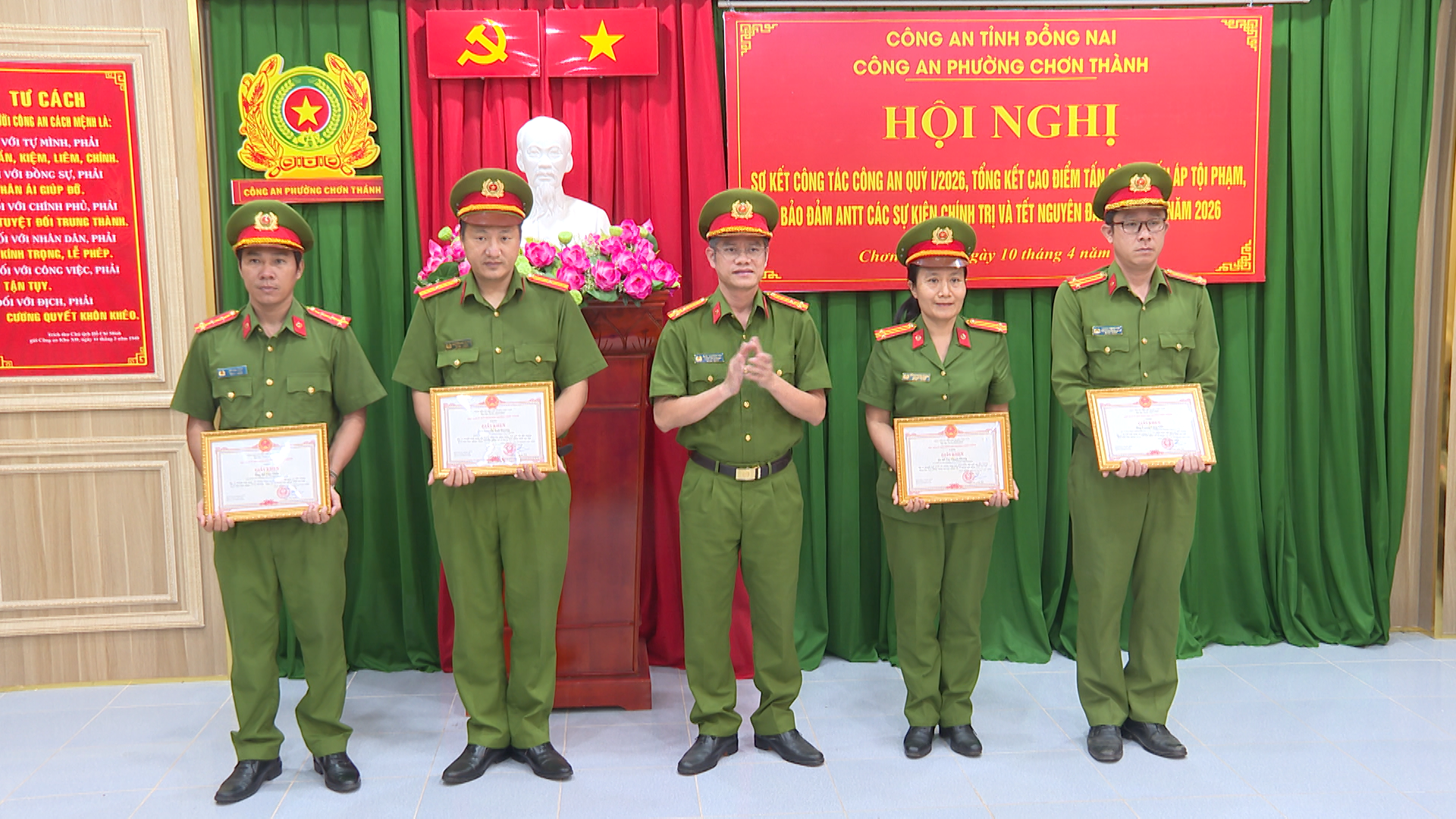 Nhân dịp này Công an phường Chơn Thành cũng đã trao giấy khen của Chủ tịch UBND phường Chơn Thành cho 04 cá nhân có thành tích xuất sắc trong công tác phát hiện, bắt giữ các đối tượng mua bán, tàng trữ và sử dụng trái phép chất ma túy.