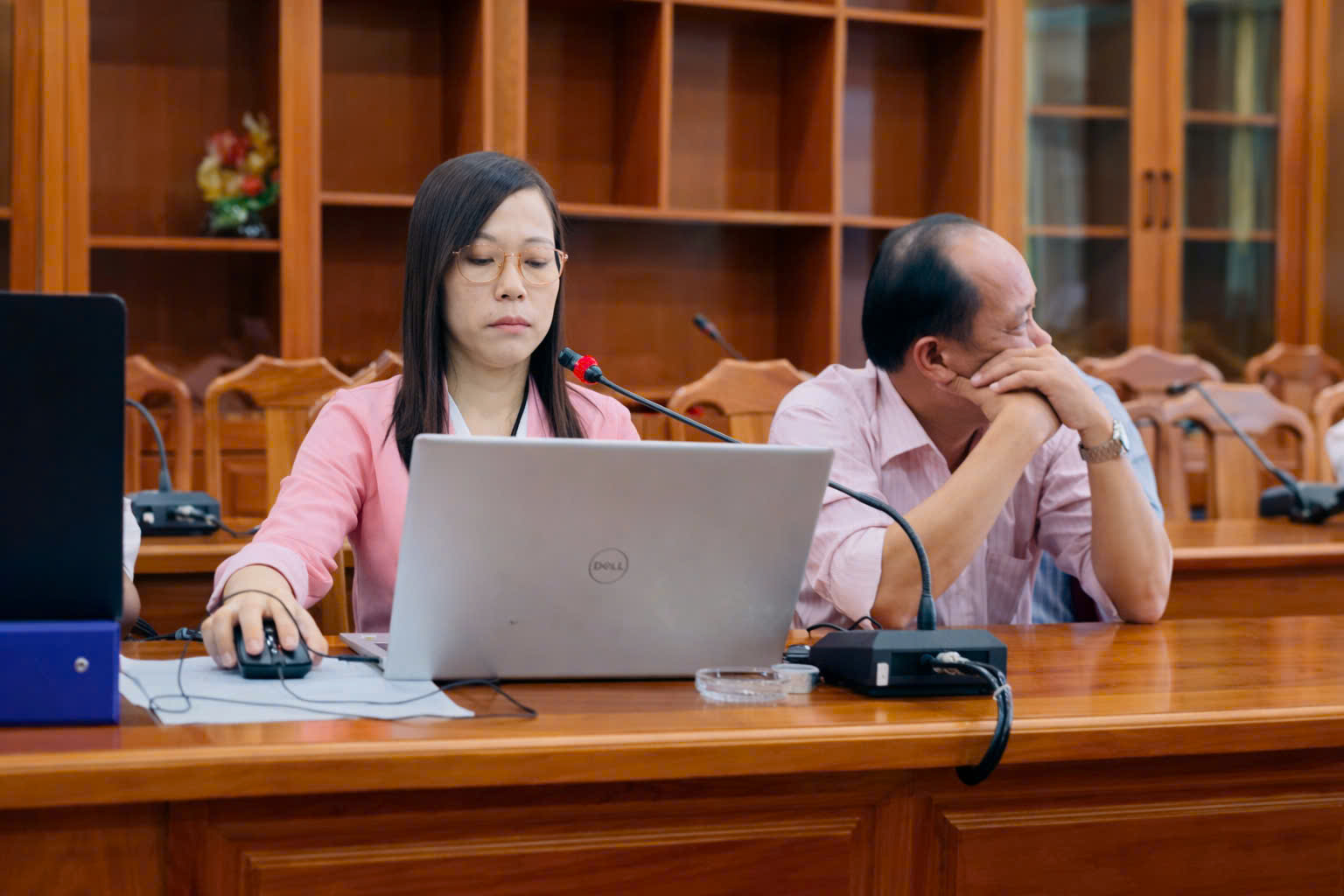 Các chuyên viên thực hiện thao tác trình bày các bước ứng dụng AI NotebookLM vào quy trình soạn thảo văn bản văn bản hành chính tại buổi tập huấn
