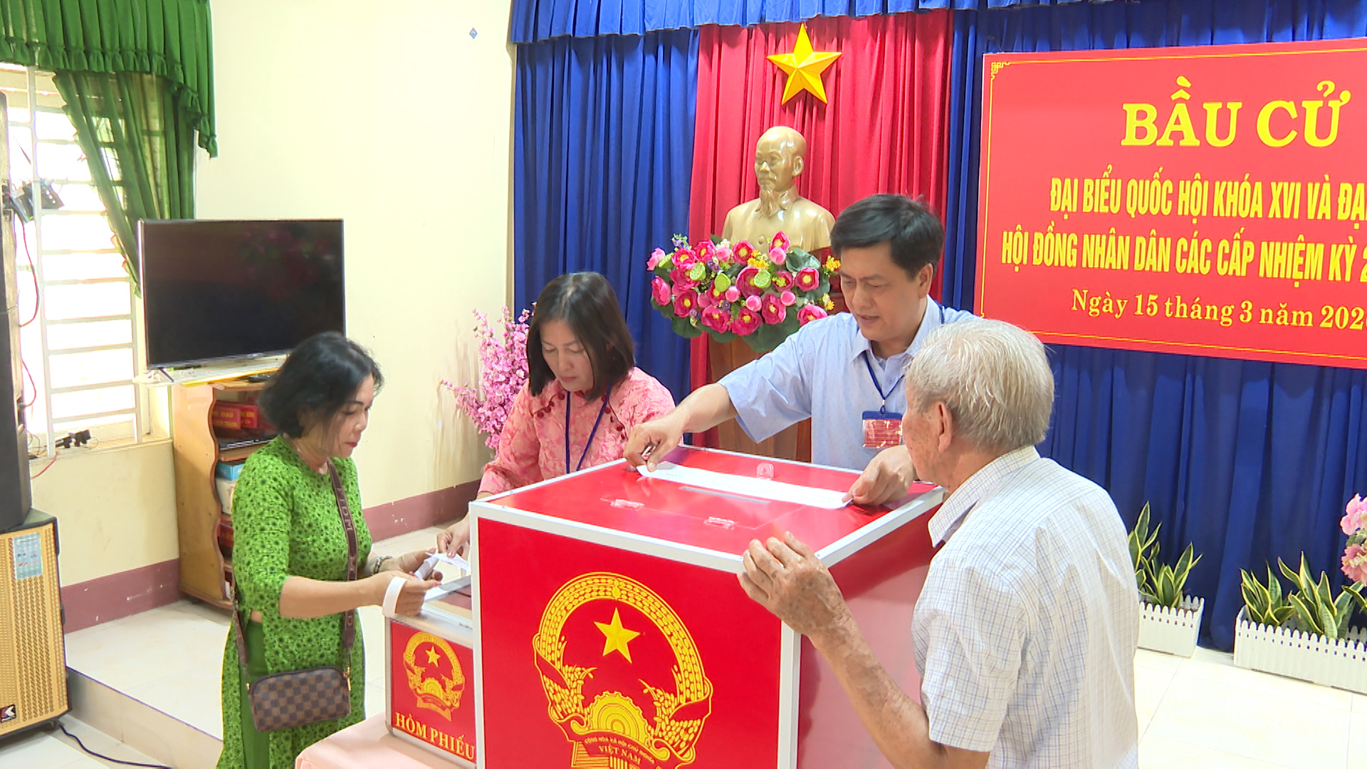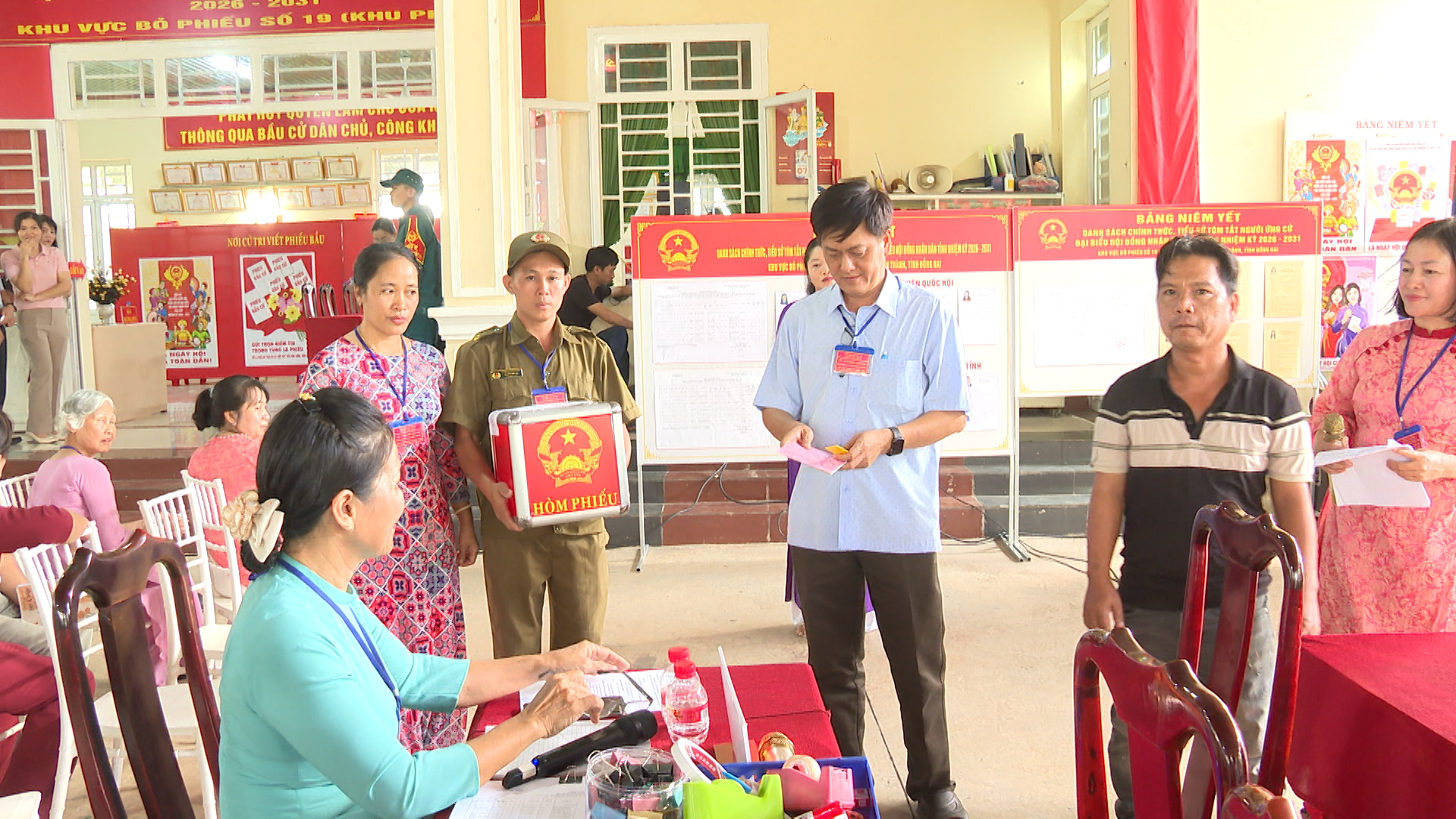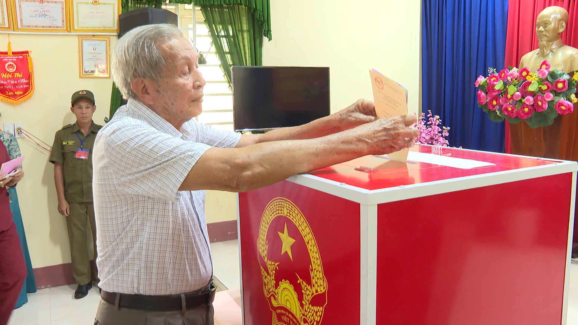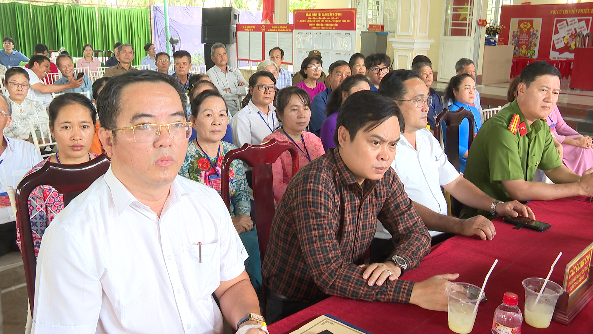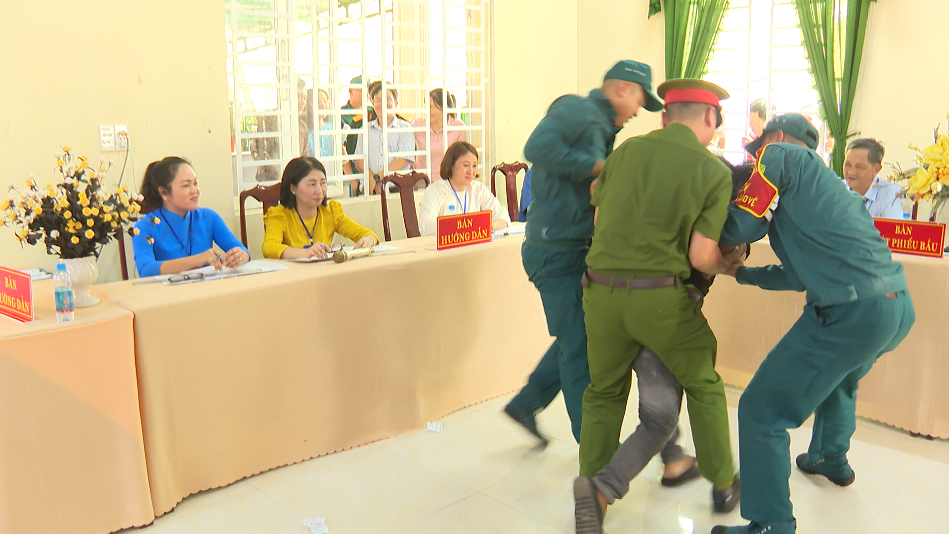 Đồng thời diễn tập xử lý các tình huống giả định: Tình huống 1: Cử tri là người cao tuổi, người khuyết tật cần hỗ trợ sử dụng hòm phiếu phụ để cho cử tri bỏ phiếu tại nơi ở. Tình huống 2: Cử tri làm mất thẻ cử tri; phản ánh, kiến nghị về sai sót thông tin trong danh sách cử tri tại khu vực bỏ phiếu. Tình huống 3: Cử tri tạm trú đến yêu cầu có nguyện vọng thực hiện quyền bầu cử tại khu vực bỏ phiếu. Tình huống 4: Cử tri khiếu nại về quyền cử tri (như: thắc mắc vì sao chỉ được bầu cử 02 cấp, không được bầu 03 cấp; cử tri khiếu nại không có tên trong danh sách cử tri; cử tri ở nước ngoài mới trở về nước yêu cầu quyền được bầu cử...). Tình huống 5: Cử tri có hành vi gây rối trật tự tại phòng bỏ phiếu. Tình huống 6: Xử lý sự cố xảy ra cháy, nổ tại khu vực bỏ phiếu. Qua đó nhằm nâng cao năng lực ứng phó, xử lý tỉnh huống và phối hợp giữa các lực lượng tham gia công tác bầu cử, đảm bảo cho cuộc bầu cử diễn ra an toàn và đạt kết quả tốt.