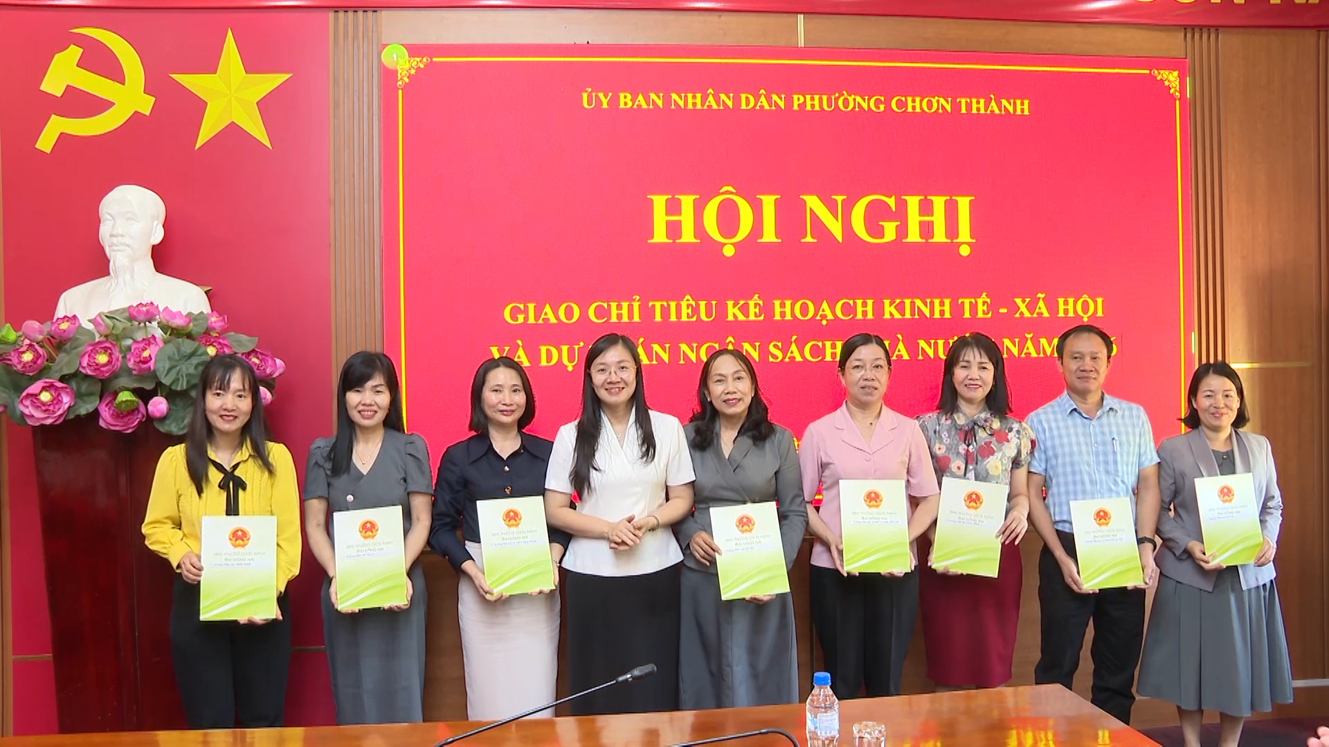 Lãnh đạo HĐND-UBND phường Chơn Thành, trao quyết định giao chỉ tiêu ngân sách năm 2026 của UBND phường cho các cơ quan, đơn vị, trường học trên địa bàn phường