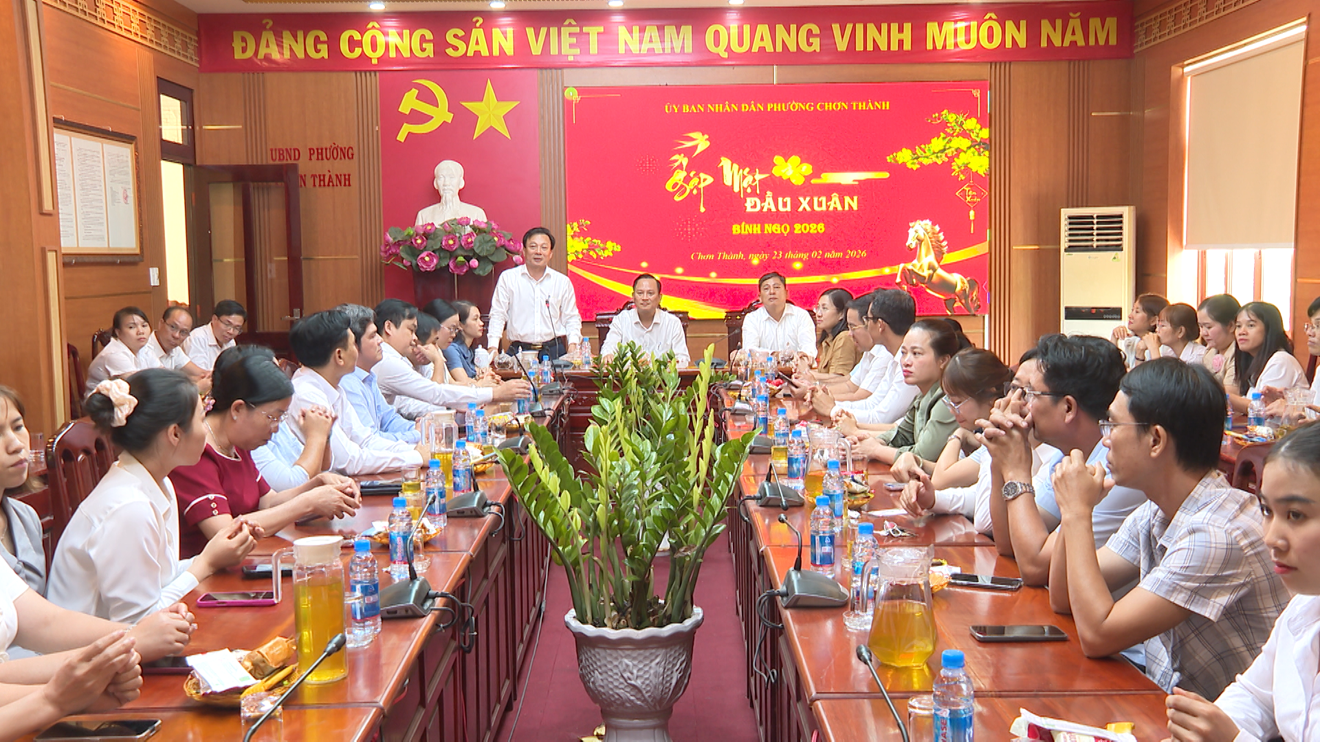 Tại buổi họp mặt đầu xuân mới 2026, Lãnh đạo Đảng ủy - HĐND - UBND - UBMTTQVN phường Chơn Thành đã thông báo nhanh tình hình thực hiện nhiệm vụ của cán bộ, công chức, người lao động trước, trong và sau Tết Nguyên đán Bính Ngọ 2026. Theo đó Lãnh đạo phường Chơn Thành đã quan tâm tạo điều kiện để cán bộ, công chức, người lao động trong phường đón tết Nguyên đán cổ truyền dân tộc thật đầm ấm, hạnh phúc. Bên cạnh đó phường còn thực hiện tốt công tác chăm lo cho gia đình chính sách, người nghèo, các đối tượng có hoàn cảnh khó khăn trên địa bàn phường. Tổ chức tốt việc cấp cứu, khám chữa bệnh cho nhân dân trong dịp tết. Trong thời gian tết tình hình ngộ độc thực phẩm và dịch bệnh không xảy ra. Về tình hình an ninh, chính trị, trật tự an toàn xã hội được đảm bảo tốt.