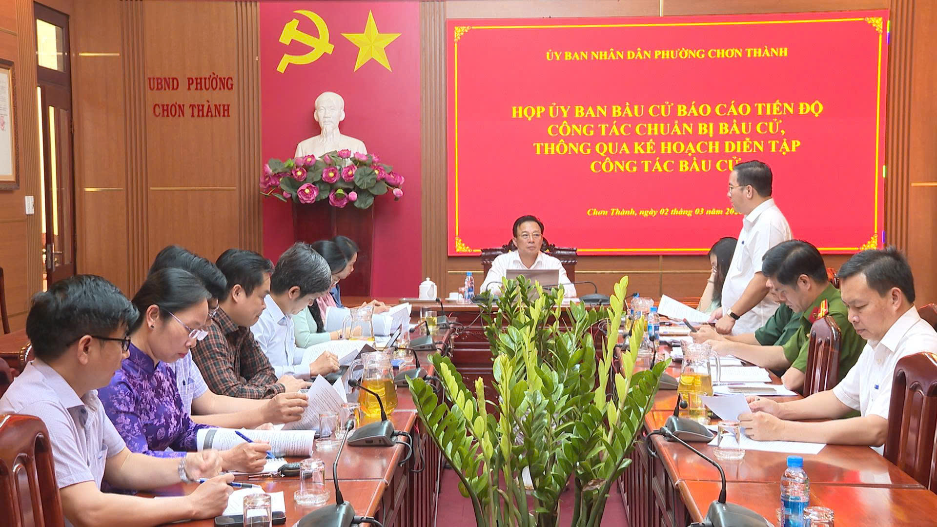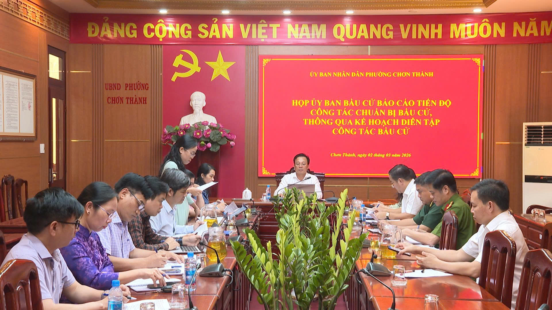 Theo báo cáo của Phòng Văn hóa- Xã hội phường đến hết ngày 2/3/2026 đã hoàn thành 100% công tác trang trí phòng bỏ phiếu tại 24 tổ bầu cử. Kết quả rà soát có 24.971 cử tri, hiện công an phường đang in thẻ cử tri và danh sách cử tri để phục vụ niêm yết tại các khu vực bỏ phiếu. Bên cạnh đó các cơ quan, đơn vị, hội đoàn thể và các khu phố đã và đang tích cực tuyên truyền về cuộc bầu cử…Tại cuộc họp Ủy ban bầu cử phường Chơn Thành cũng thông qua dự thảo kế hoạch tổ chức diễn tập nghiệp vụ ngày bầu cử đại biểu Quốc hội khóa XVI và bầu cử đại biểu Hội đồng nhân dân các cấp, nhiệm kỳ 2026-2031, trên địa bàn phường. Địa điểm tại Khu vực bỏ phiếu số 19 (khu phố 6) thuộc Đơn vị bầu cử số 05, tại Nhà văn hóa khu phố 6. Thời gian diễn tập bắt đầu từ 13 giờ 30 phút ngày 07/03/2026 (thứ Bảy). Thực hành diễn tập toàn bộ quy trình từ chuẩn bị đến kết thúc bỏ phiếu phản ánh sát tình huống thực tế. Qua đó rút kinh nghiệm, hoàn thiện các phương án thực tế, với mục tiêu đảm bảo ngày bầu cử chính thức diễn ra an toàn, dân chủ, đúng pháp luật, trật tự, tiết kiệm và hiệu quả.