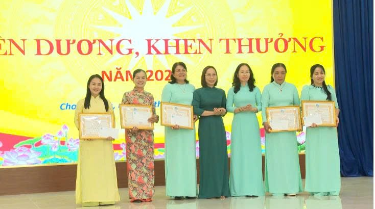 Chủ tịch Hội Liên hiệp Phụ nữ phường Chơn Thành bà Trần Thị Trang Nhung và Phó Giám đốc Ngân hàng Chính sách xã hội Chơn Thành bà Lê Thị Hạnh trao Giấy khen cho 6 cá nhân là Tổ trưởng Tổ Tiết kiệm và Vay vốn tiêu biểu