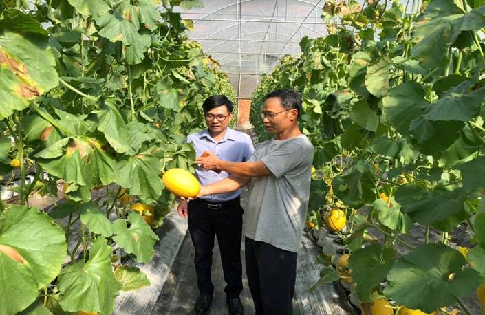 Đồng chí Nguyễn Tấn Hiệp - Đảng ủy viên, Phó Chủ tịch Ủy ban MTTQ Việt Nam, Chủ tịch Hội Nông dân phường kiểm tra chất lượng của dưa lưới