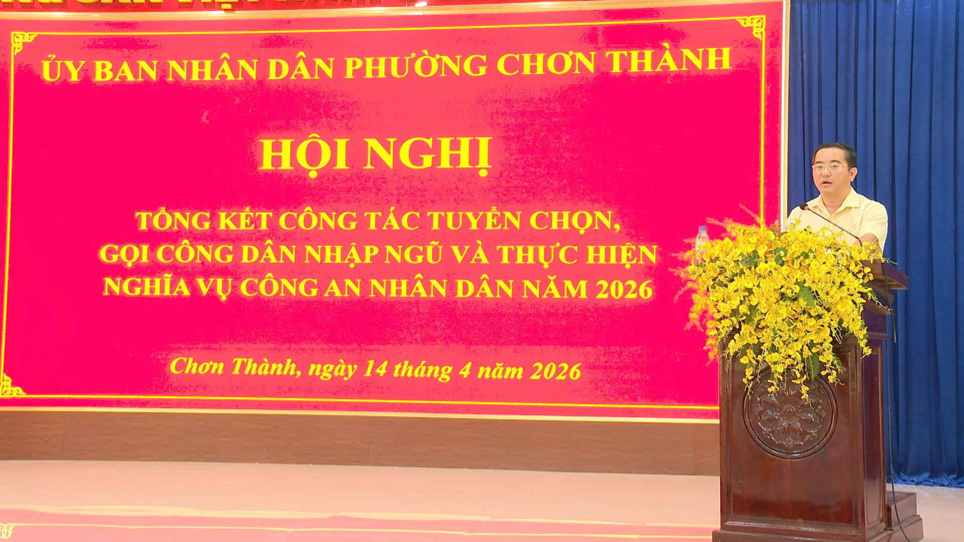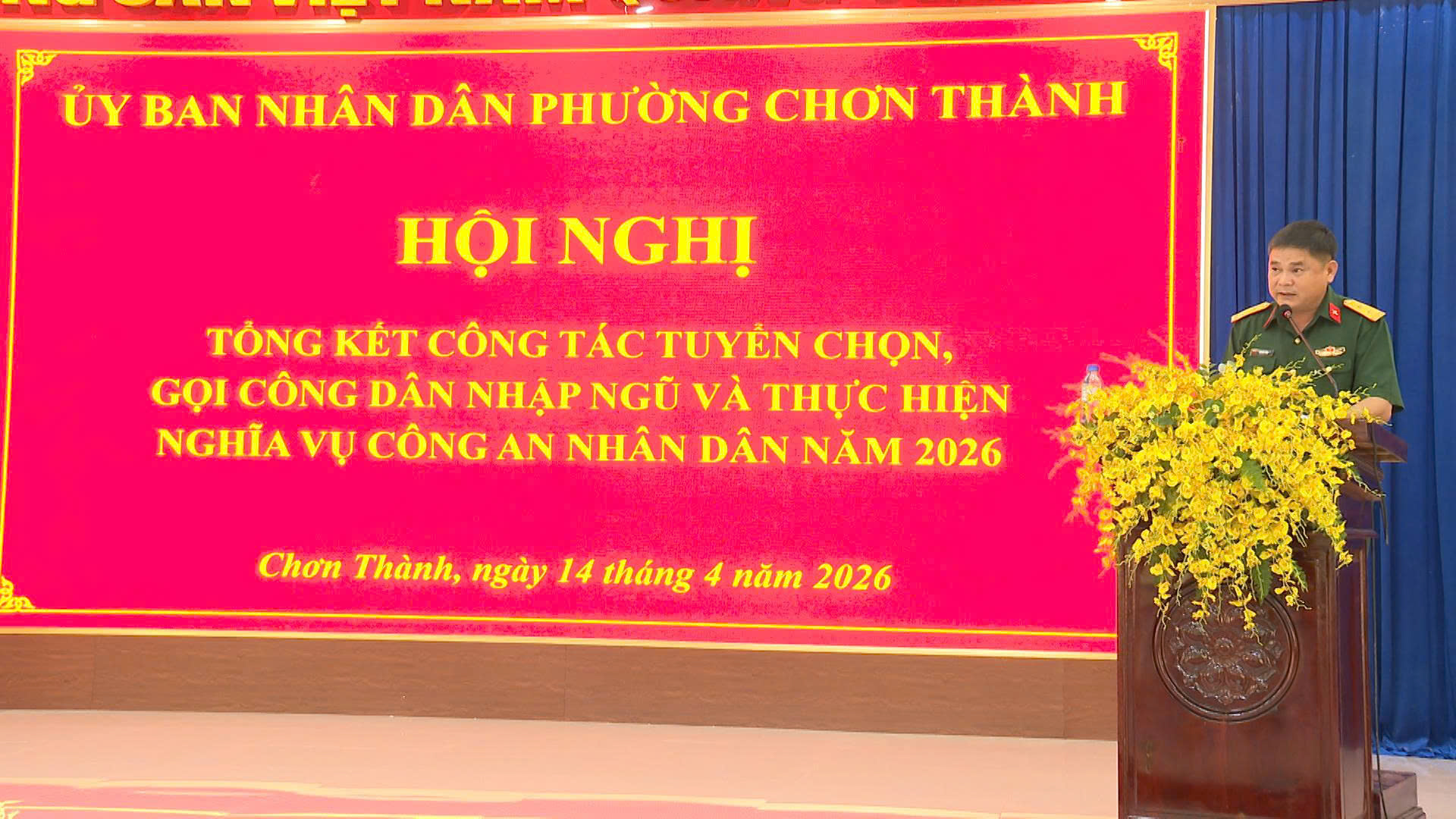 Ngày 14-4-2026, UBND phường Chơn Thành đã tổ chức hội nghị tổng kết công tác tuyển chọn, gọi công dân nhập ngũ và thực hiện nghĩa vụ Công an nhân dân, năm 2026. Tham dự hội nghị có đồng chí Nguyễn Minh Bình, Bí thư Đảng ủy, Chủ tịch HĐND phường; đồng chí Nguyễn Anh Tài, Phó Bí thư Đảng ủy, Chủ tịch UBND phường; đồng chí Thái Thị Tuyết Hồng, Phó chủ tịch HĐND phường; đại diện Lãnh đạo Ban Chỉ huy PTKV 4 - Bình Long; lãnh đạo các cơ quan, đơn vị, hội đoàn thể và các khu phố trong toàn phường.