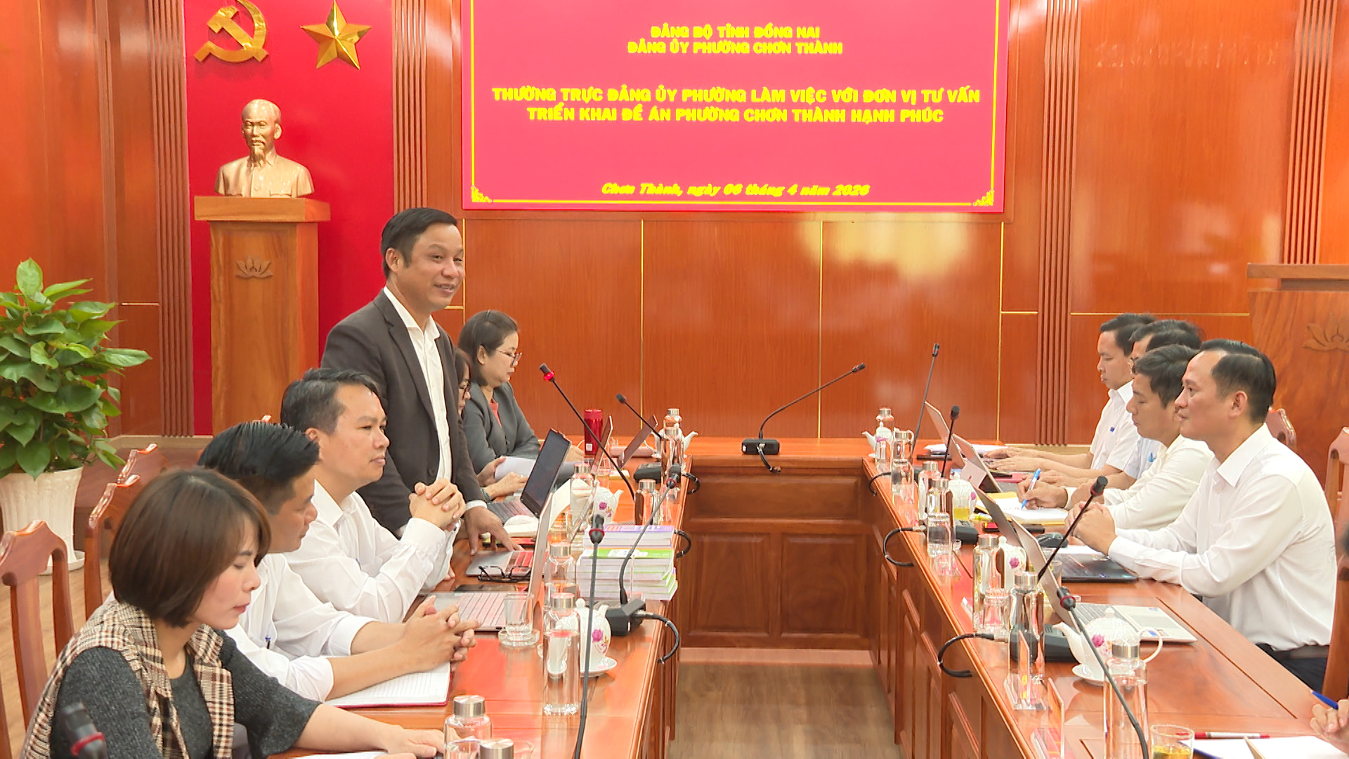 Chiều ngày 6/4/2026, Thường trực Đảng ủy phường Chơn Thành đã có buổi làm việc với Đơn vị tư vấn triển khai Đề án phường Chơn Thành Hạnh phúc. Cùng tham dự buổi làm việc có các đồng chí Ủy viên Ban Thường vụ Đảng ủy phường; Trưởng, phó các Ban của HĐND phường; Văn phòng Đảng ủy; đại diện lãnh đạo các tổ chức chính trị, xã hội phường; Bí thư Đảng bộ Trường THPT Chu Văn An; lãnh đạo Phòng Văn hóa - Xã hội; Phòng Kinh tế - Hạ tầng và Đô thị; Trung tâm Dịch vụ tổng hợp phường.
