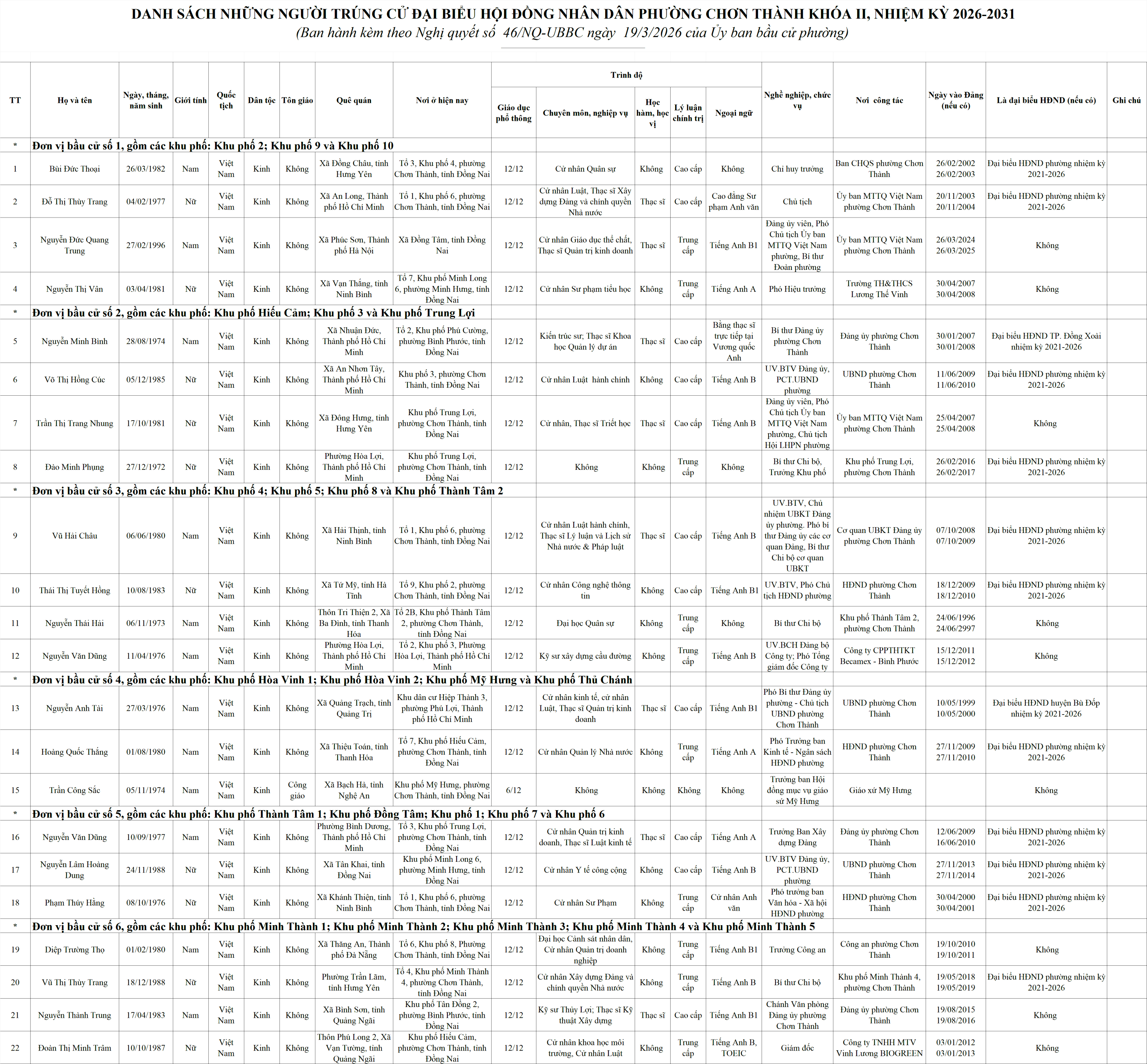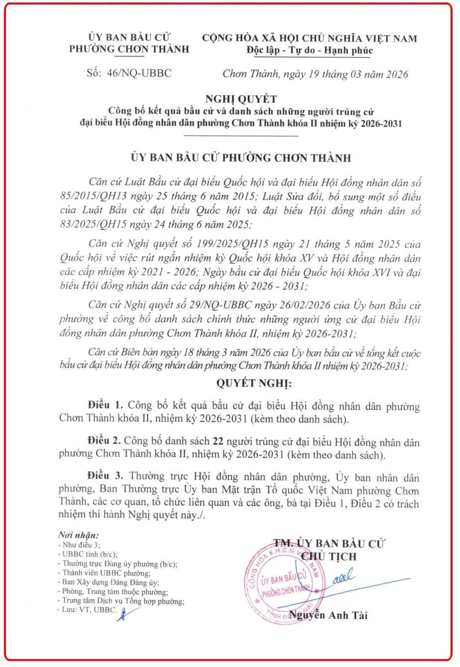 Ngày 19/3/2026, Ủy ban Bầu cử phường Chơn Thành, tỉnh Đồng Nai đã ban hành Nghị quyết số 46/NQ-UBBC về công bố kết quả bầu cử và danh sách những người trúng cử đại biểu HĐND phường Chơn Thành, khóa II, nhiệm kỳ 2026-2031.