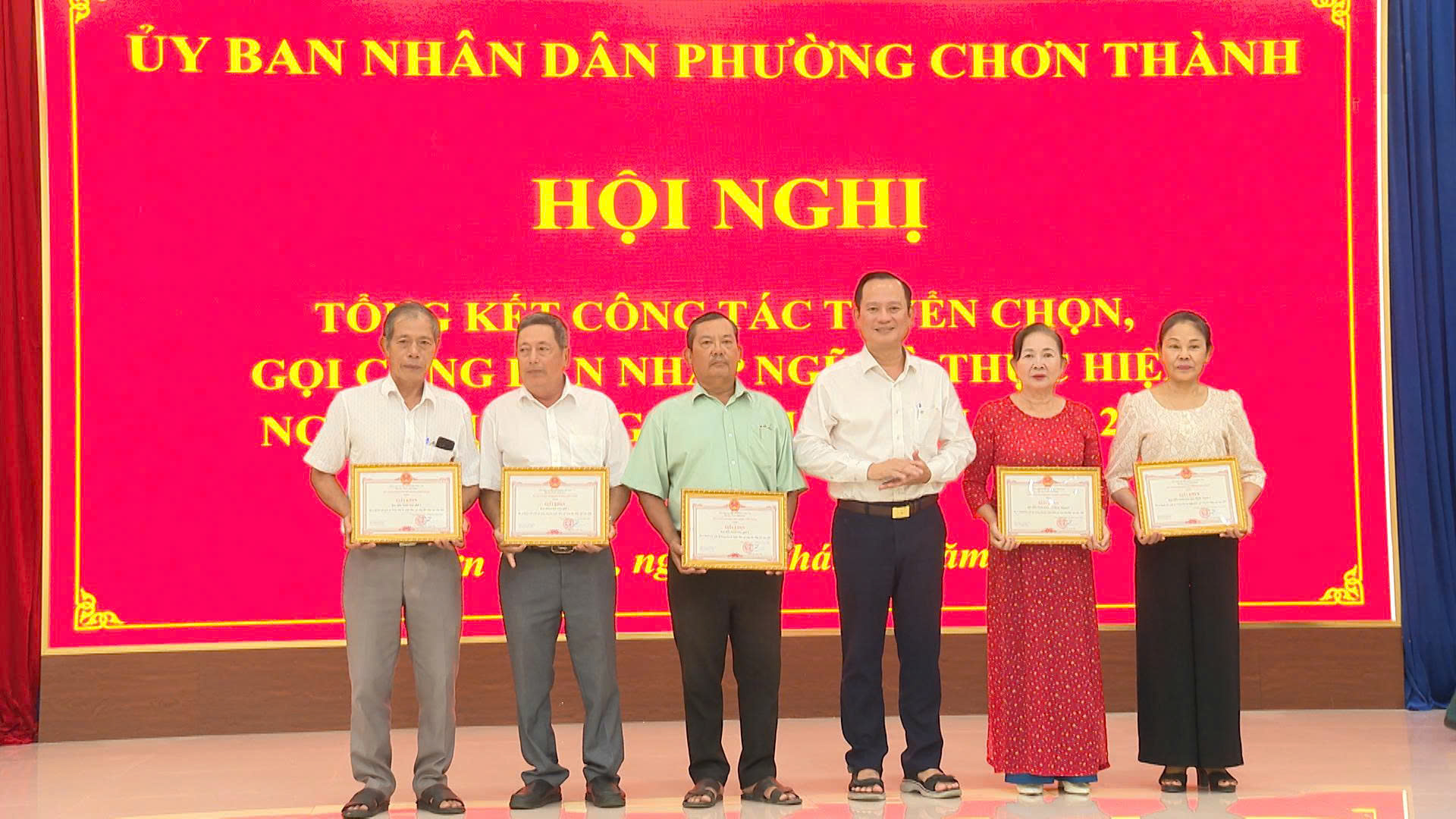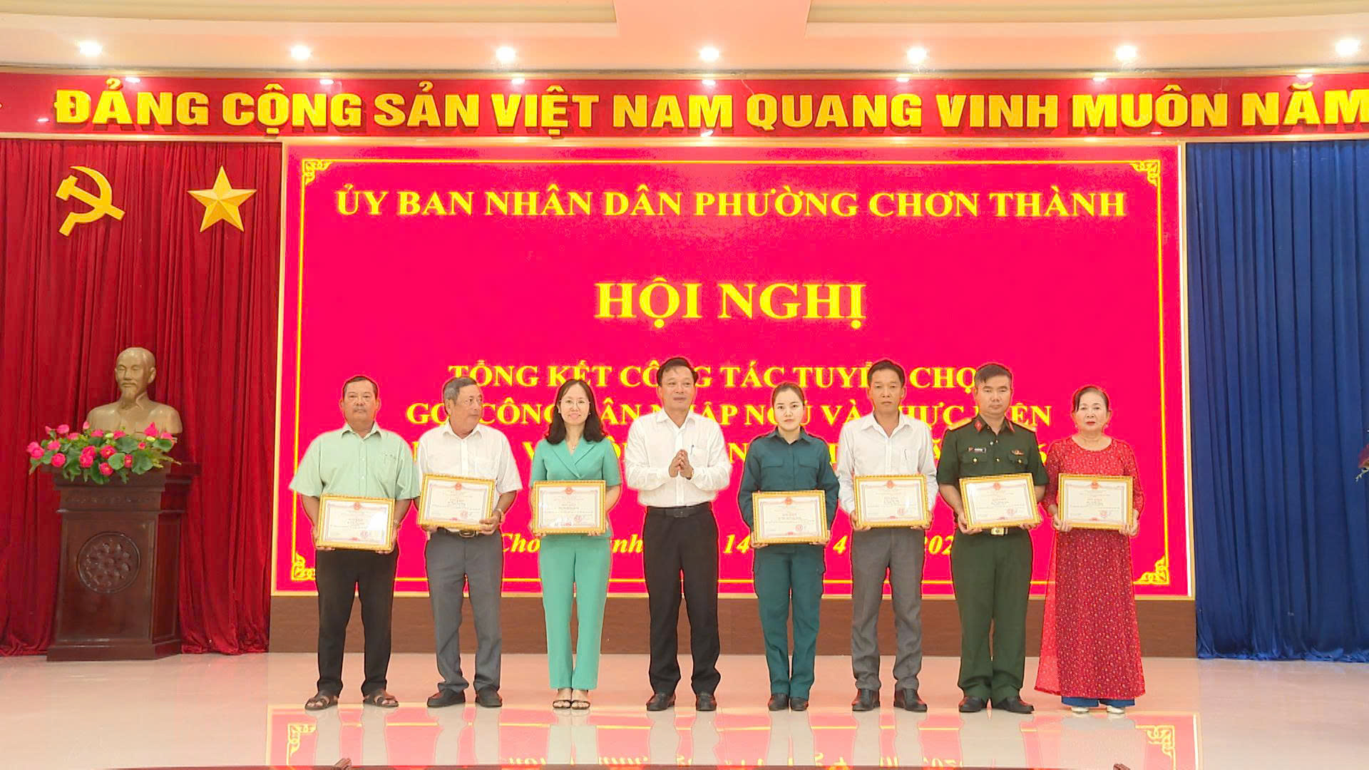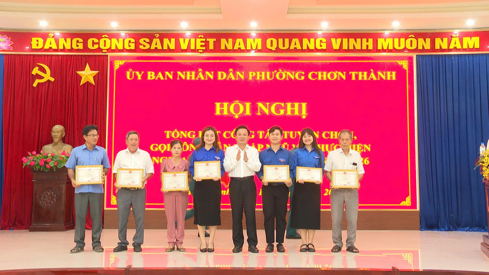 Nhân dịp này UBND phường Chơn Thành đã tặng giấy khen cho 5 tập thể, 14 cá nhân có thành tích xuất sắc trong công tác tuyển chọn, gọi công dân nhập ngũ năm 2026.