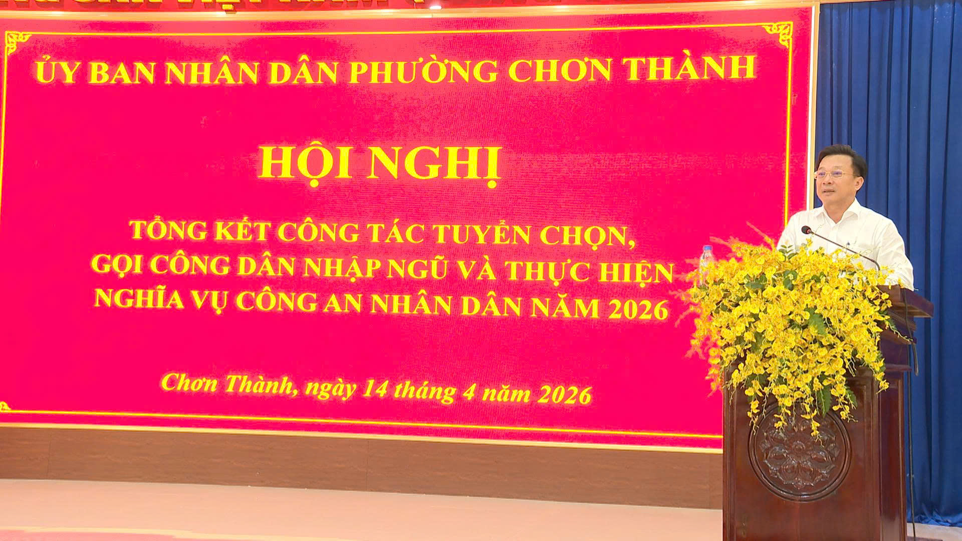 Đồng chí Bùi Phước Linh, Trưởng phòng Văn hóa - Xã hội phường Chơn Thành công bố quyết định khen thưởng của Chủ tịch UBND phường cho các tập thể, cá nhân có thành tích xuất sắc trong công tác tuyển chọn, gọi công dân nhập ngũ năm 2026