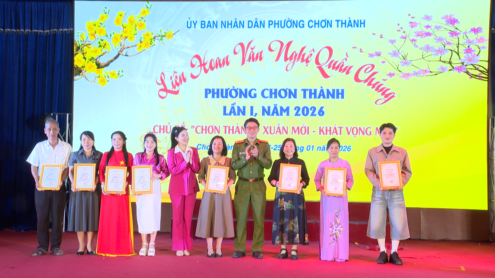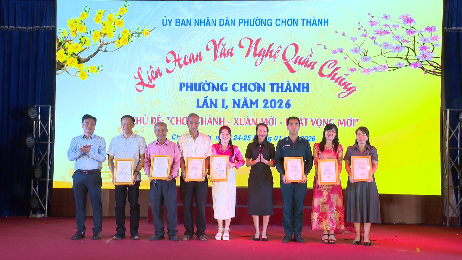 Liên hoan văn nghệ quần chúng phường Chơn Thành lần thứ I năm 2026, được diễn ra trong 1,5 ngày (từ ngày 24- sáng 25/01/2026). Tham gia Liên hoan có 18 đội văn nghệ quần chúng đến từ các trường học, đoàn thể và khu phố trên địa bàn phường. Mỗi đội đã lần lượt tranh tài biểu diễn một chương trình văn nghệ bao gồm các thể loại: Đơn ca, Song ca, tam ca, Tốp ca - hợp ca; Múa hoặc hát múa. Gắn liền với nội dung: ca ngợi Đảng Cộng sản Việt Nam quang vinh, Chủ tịch Hồ Chí Minh; ca ngợi truyền thống yêu nước trong sự nghiệp đấu tranh giải phóng dân tộc; những hình ảnh, tấm gương xuất sắc trong lao động sản xuất; những điển hình tiên tiến trong thực hiện phong trào thi đua yêu nước ở địa phương; thể hiện không khí mùa Xuân; khát vọng vươn lên của Đảng bộ, chính quyền và Nhân dân phường Chơn Thành trong xây dựng đô thị văn minh. Theo đánh giá của ban giám khảo các tiết mục văn nghệ tham gia Liên hoan đã được các đội dàn dựng công phu, hoành tráng, sôi động đã thu hút Nhân dân đến xem và cổ vũ nhiệt tình.