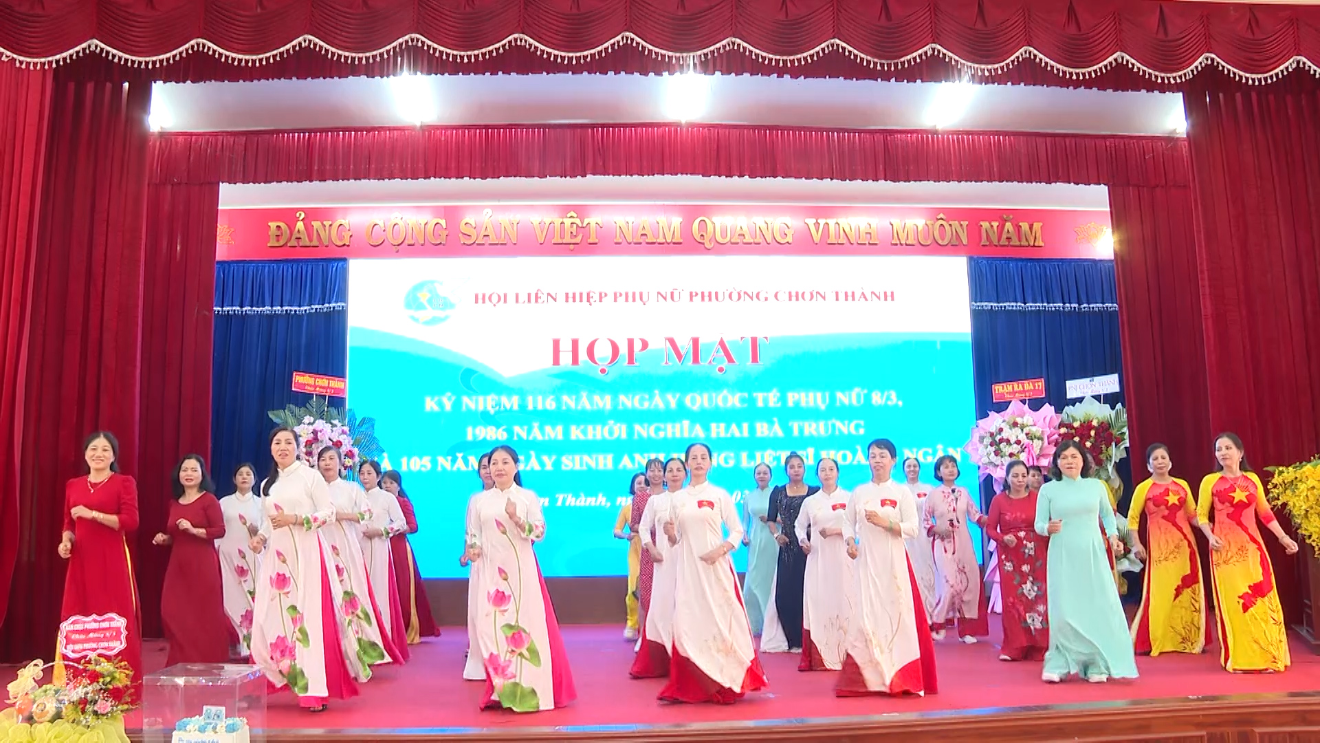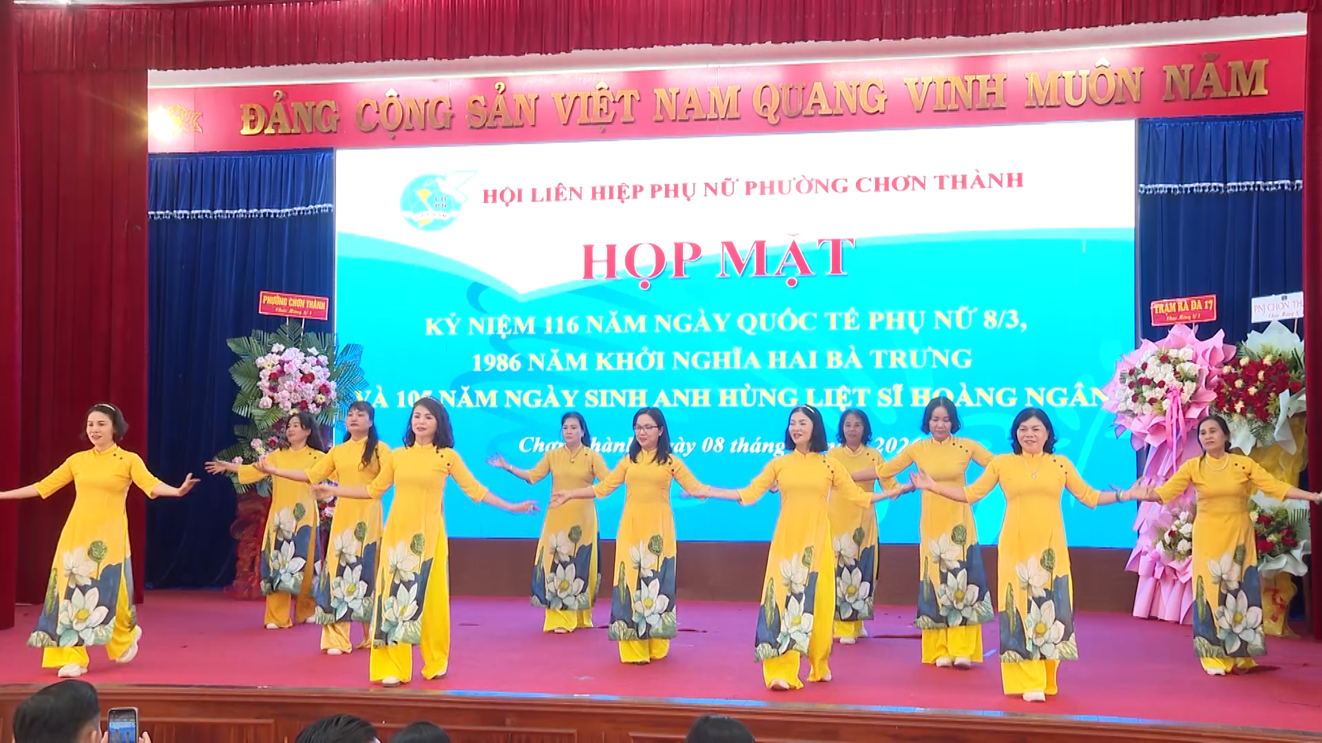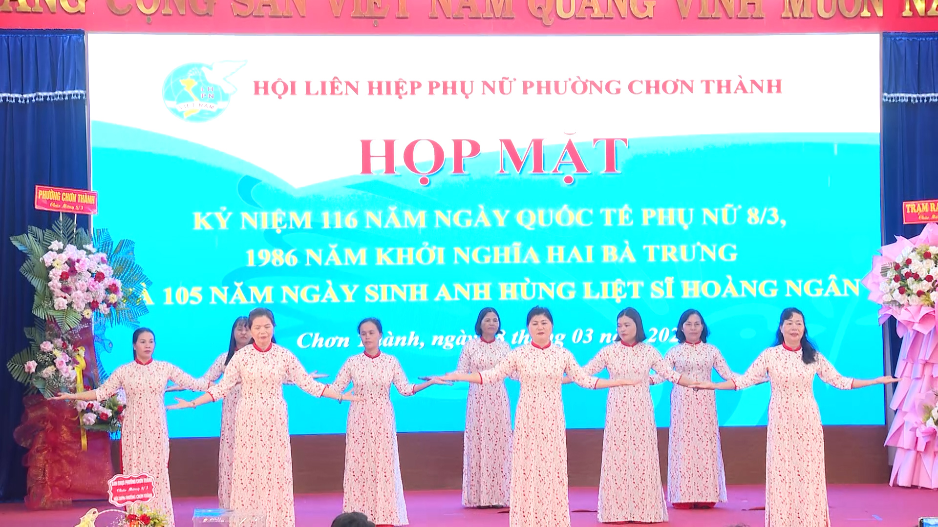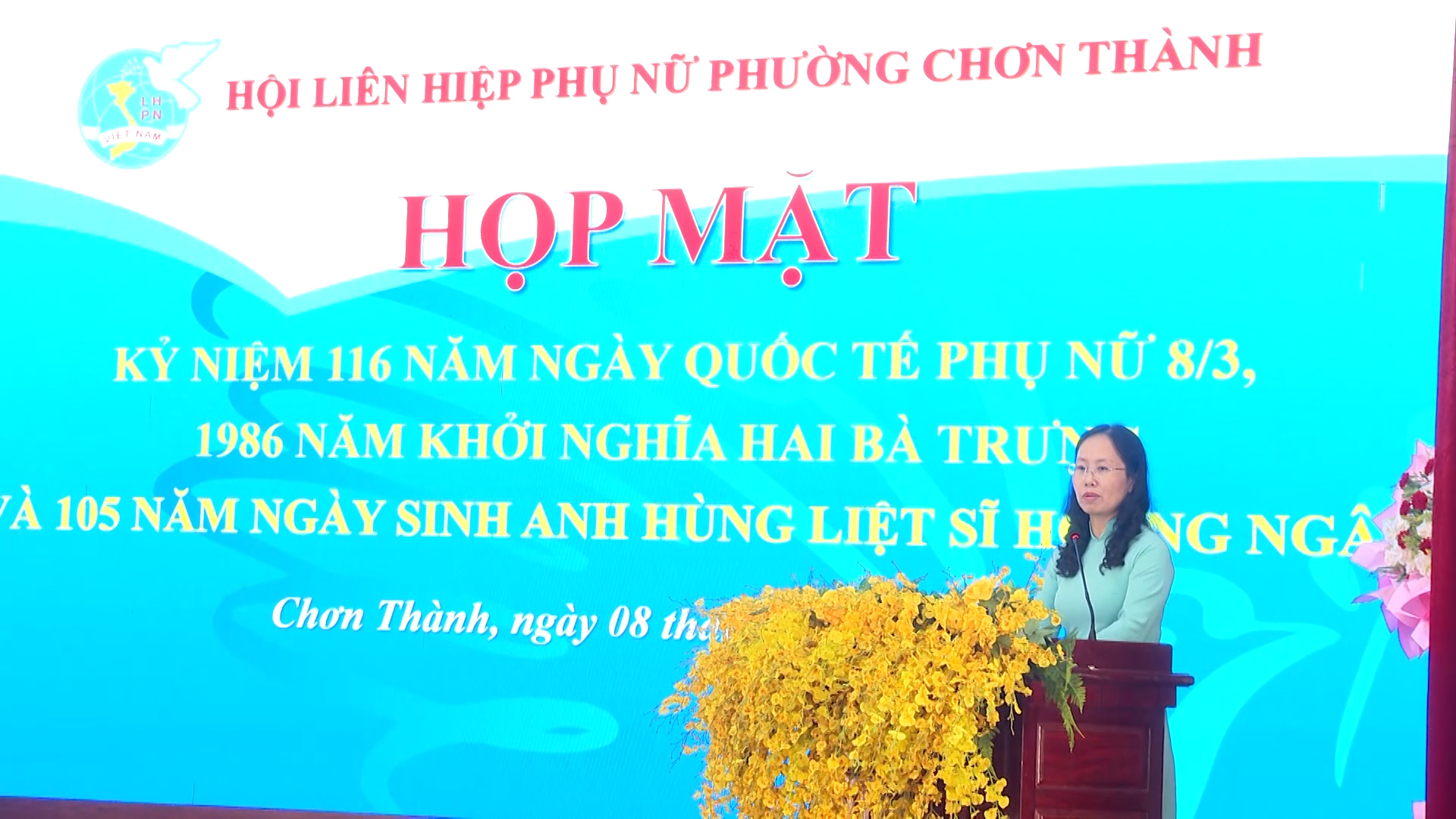 Tại buổi họp mặt, các đại biểu cùng ôn lại truyền thống 116 năm ngày Quốc tế Phụ nữ (08/3/1910 - 08/3/2026) và truyền thống phụ nữ Việt Nam. Trong thời gian qua các cấp Hội phụ nữ trên địa bàn phường Chơn Thành, đã tiếp tục xây dựng tổ chức hội ngày càng vững mạnh, đồng thời có nhiều công trình, phần việc vì cuộc sống cộng đồng.