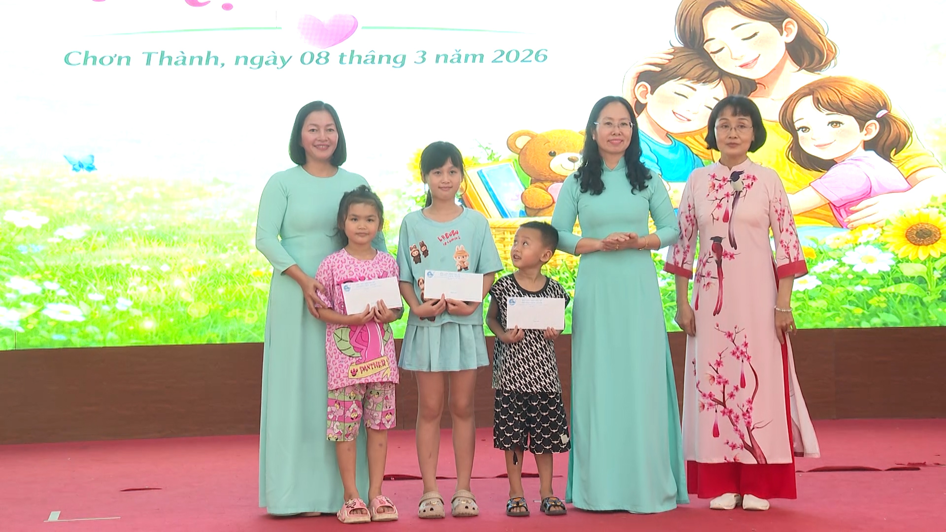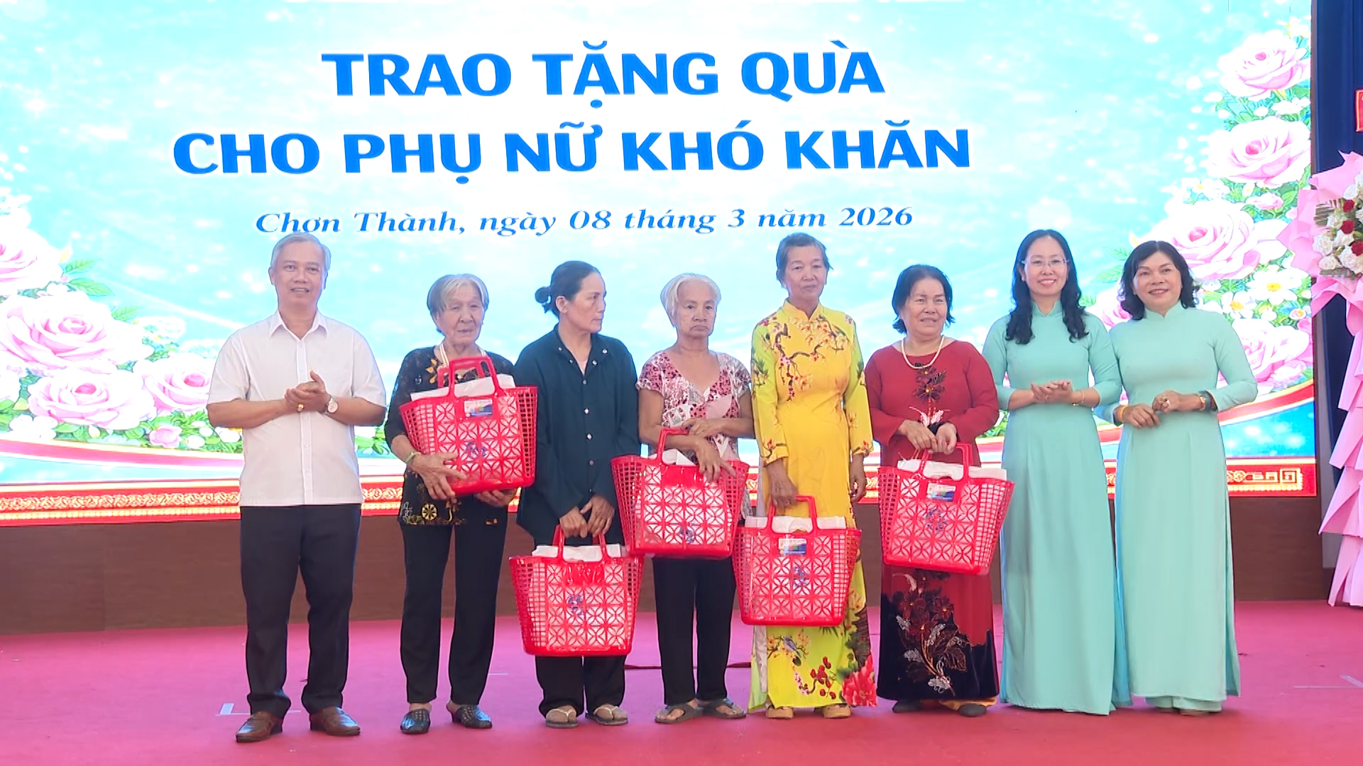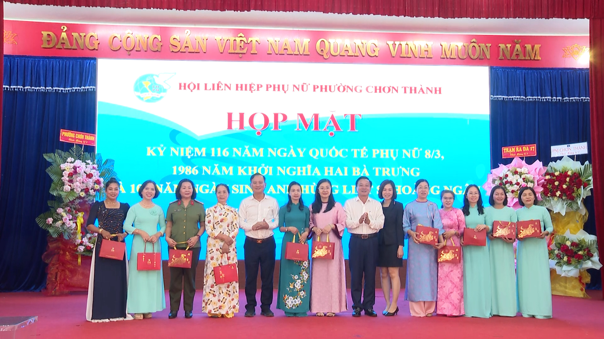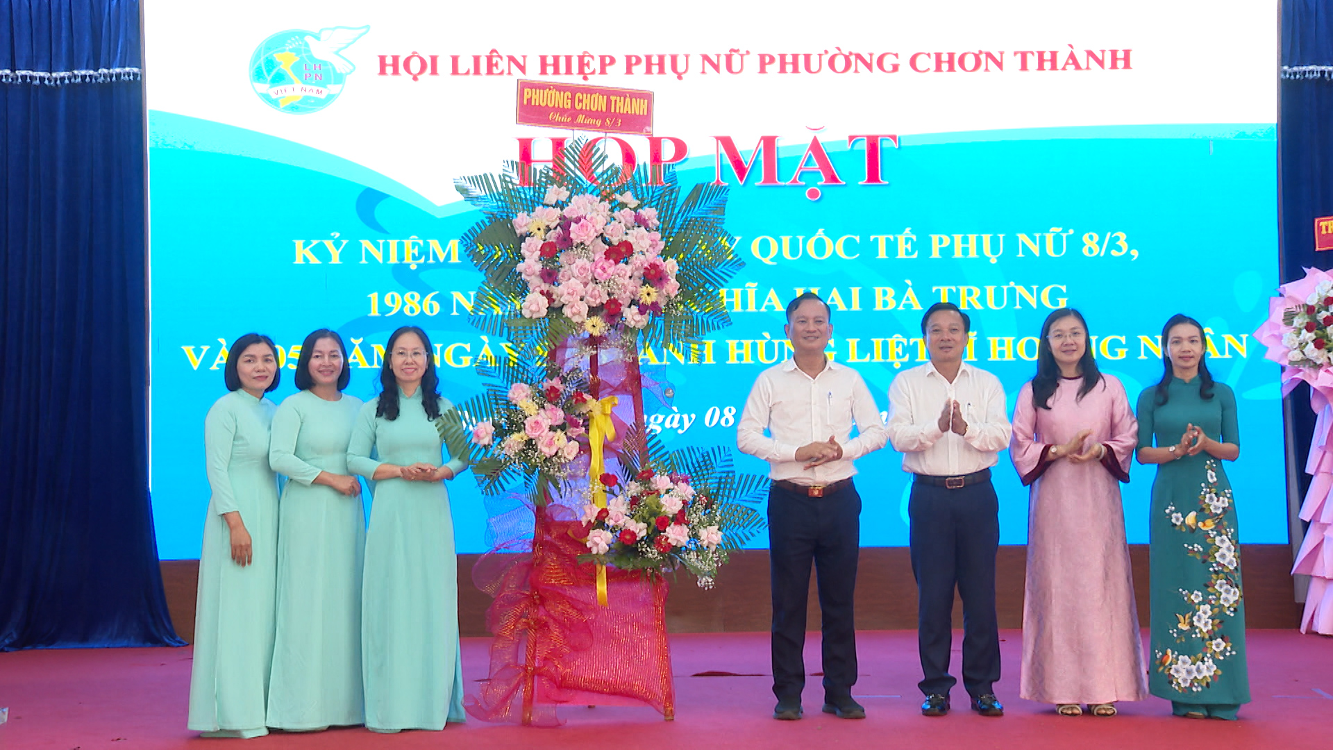 Tại buổi họp mặt lãnh đạo Đảng ủy-HĐND-UBND-UBMTTQ Việt Nam phường Chơn Thành đã trao tặng bằng khen của Hội LHPN tỉnh Đồng Nai cho Hội LHPN phường Chơn Thành và 01 cá nhân có thành tích xuất sắc trong hoạt động ủy thác ngân hàng năm 2025; Đồng thời tặng hoa, quà chúc mừng cùng cán bộ, hội viên phụ nữ nhân dịp kỷ niệm Ngày Quốc tế Phụ nữ 8/3. Động viên các chị em phụ nữ ra sức phấn đấu lao động giỏi, hoàn thành xuất sắc nhiệm vụ được giao, năm 2026.