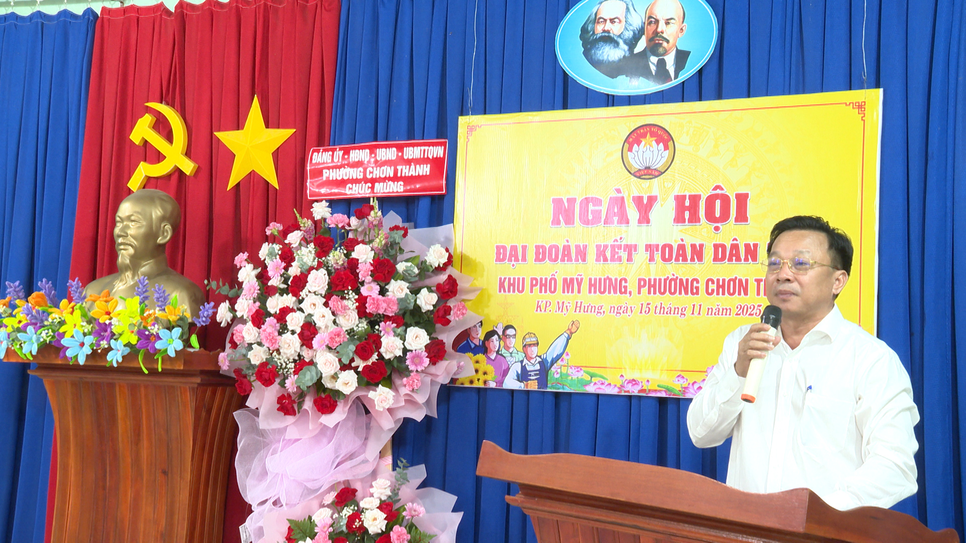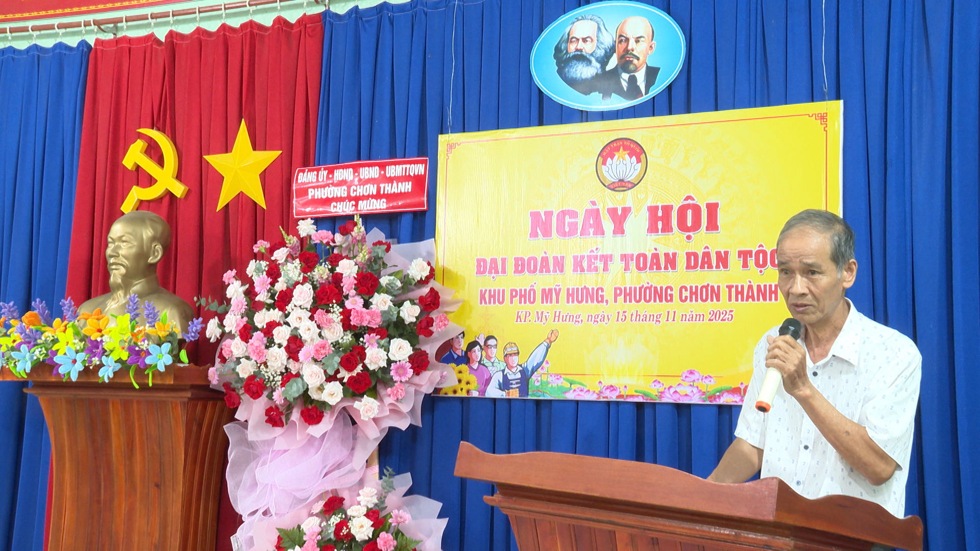 Lãnh đạo Khu phố Mỹ Hưng, phường Chơn Thành, ôn lại lịch sử kỷ niệm 95 năm Ngày truyền thống Mặt trận Tổ quốc Việt Nam (18/11/1930 - 18/11/2025) và báo cáo kết quả của khu dân cư và phát động các phong trào thi đua tại ngày hội