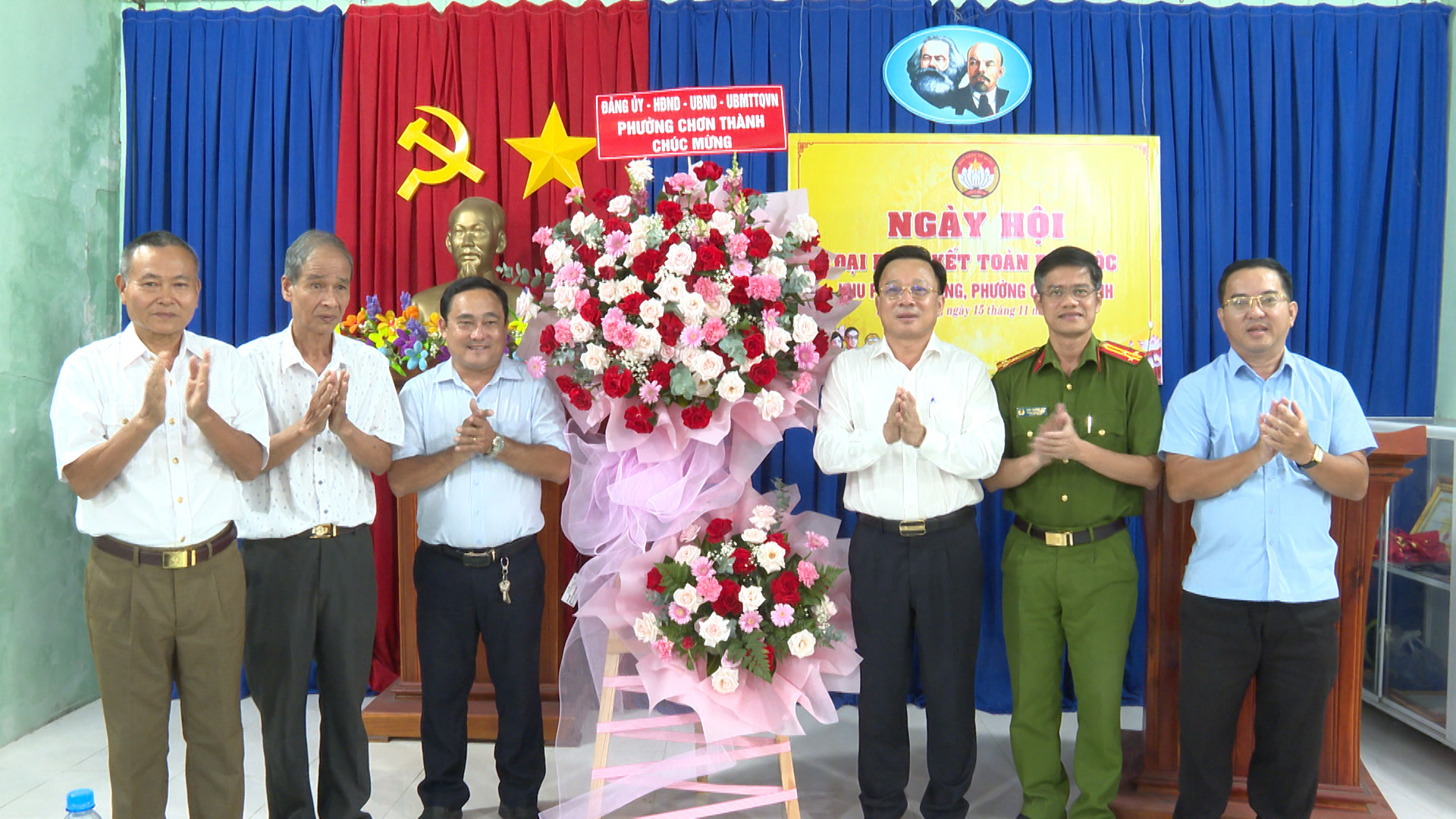 Đồng chí Nguyễn Anh Tài, Phó Bí thư Đảng ủy, Chủ tịch UBND phường Chơn Thành cùng lãnh đạo các cơ quan, đơn vị phường, tăng hoa chúc mừng Khu phố Mỹ Hưng tại ngày hội