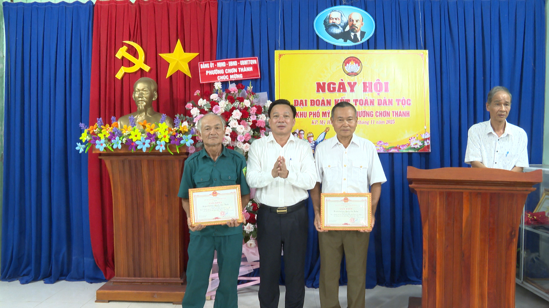 Nhân dịp này, Đảng ủy-HĐND-UBND-UBMTTQVN phường Chơn Thành đã tặng hoa chúc mừng Khu dân cư Mỹ Hưng. Đồng thời UBND phường Chơn Thành, tặng giấy khen cho 2 hộ gia đình, đã có thành tích tiêu biểu trong thực hiện cuộc vận động các phong trào thi đua ở khu dân cư năm 2025.