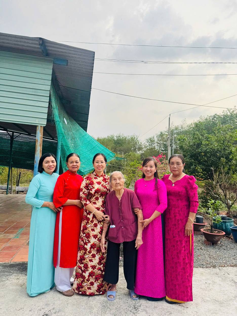 Cán bộ, hội viên phụ nữ phường Chơn Thành chụp hình lưu niệm với Mẹ Việt Nam Anh hùng Nguyễn Thị Ngừng