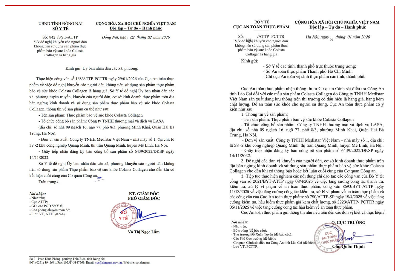 Theo thông báo của Cục An toàn thực phẩm (Công văn số 168/ATTP-PCTTR ngày 29/01/2026) và Sở Y tế tỉnh Đồng Nai (Công văn số 942/SYT-ATTP ngày 02/02/2026) về việc khuyến cáo người dân không nên sử dụng sản phẩm “Thực phẩm bảo vệ sức khỏe Colasta Collagen” do nghi là hàng giả.