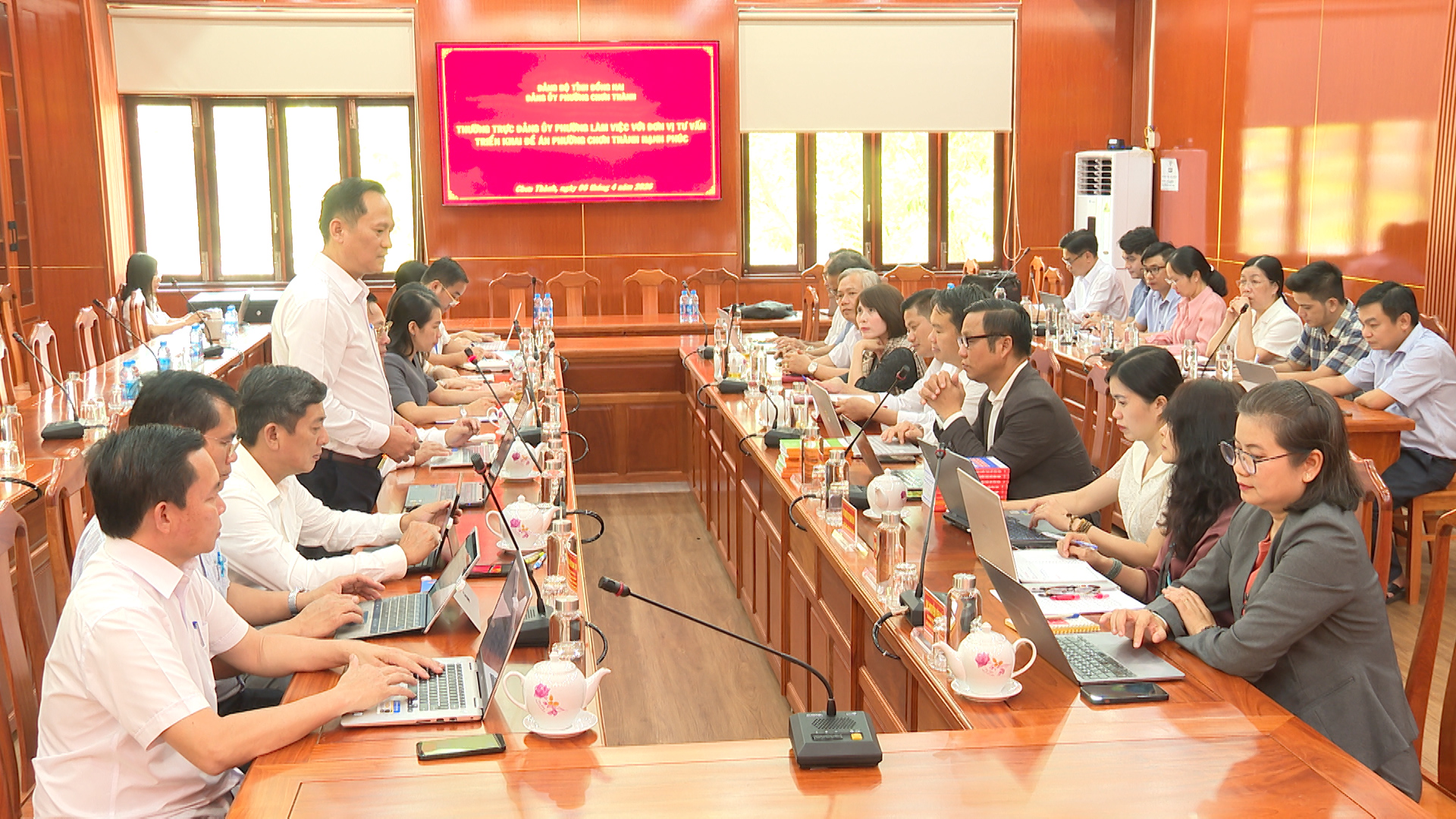 Các đại biểu và các thành viên trong Đơn vị tư vấn, trình bày góp ý những nội dung triển khai Đề án phường Chơn Thành Hạnh phúc