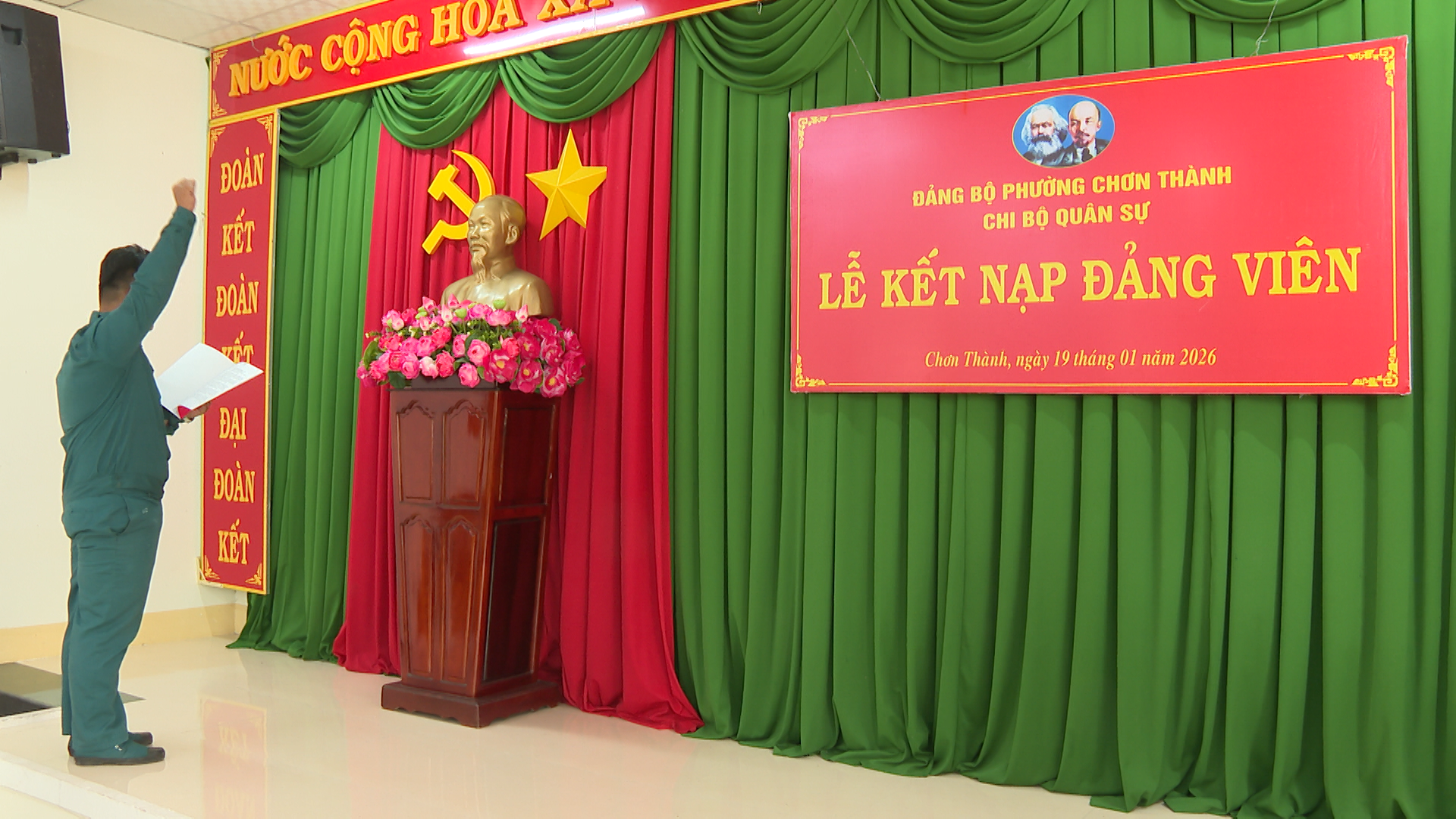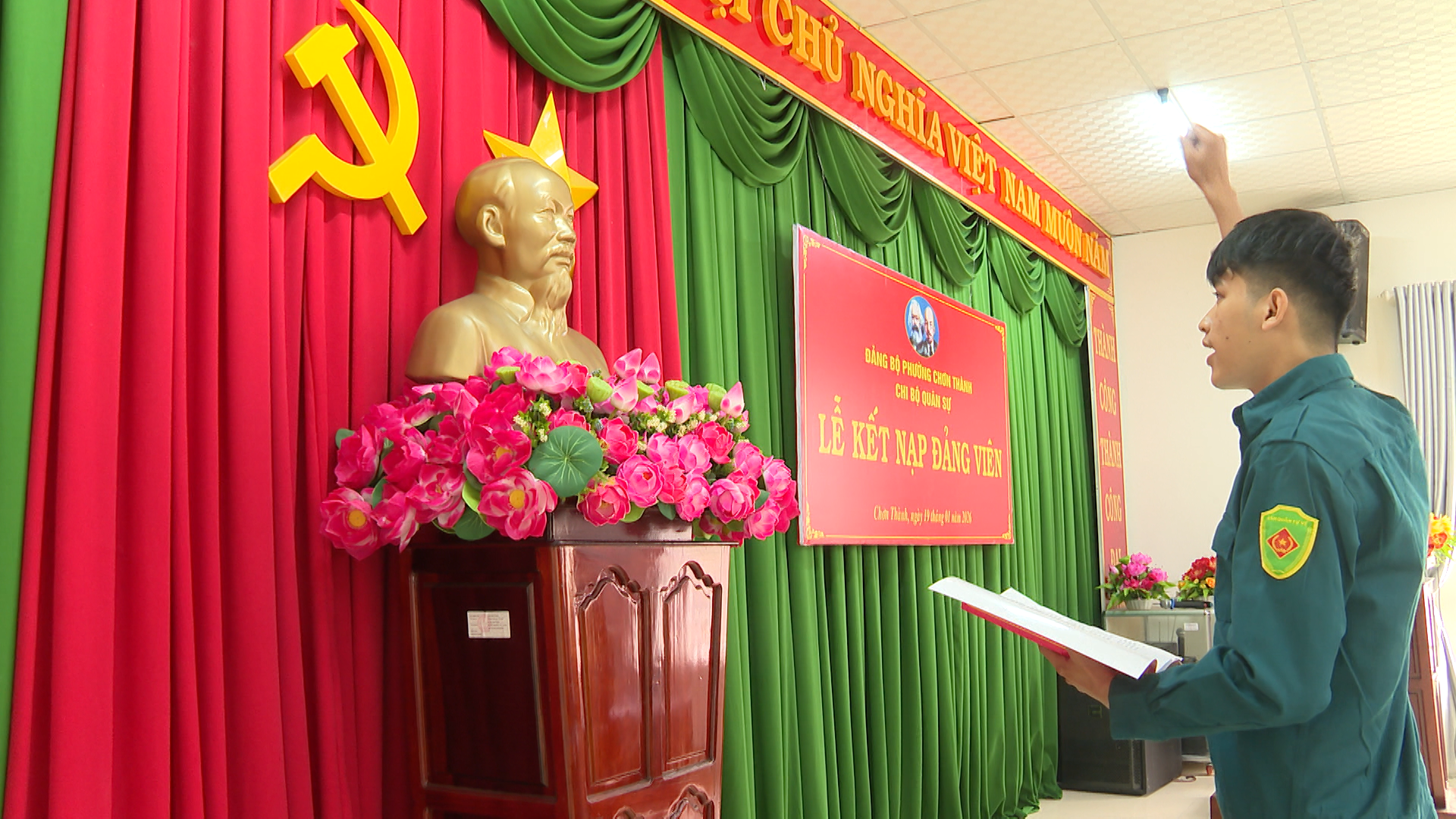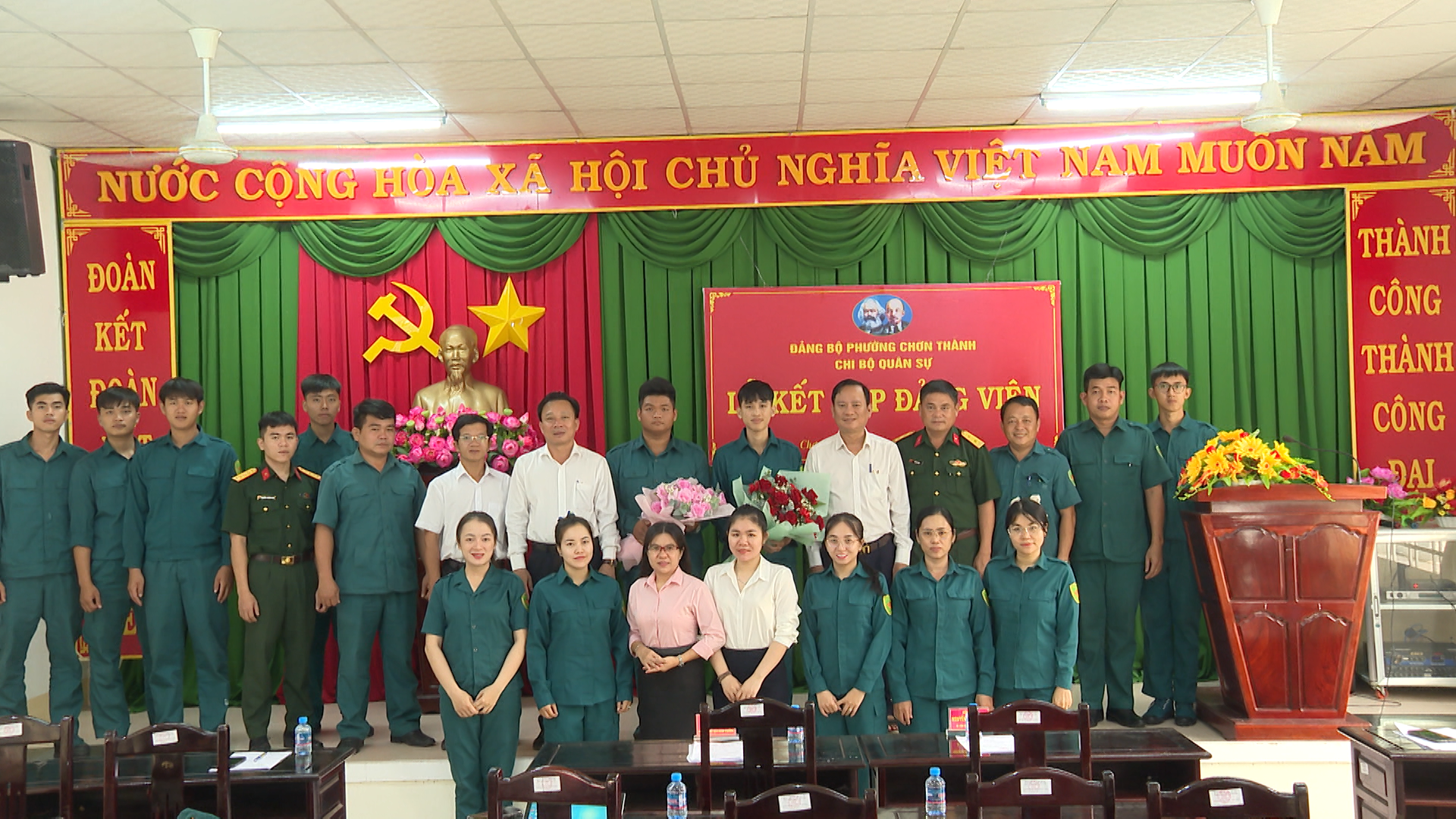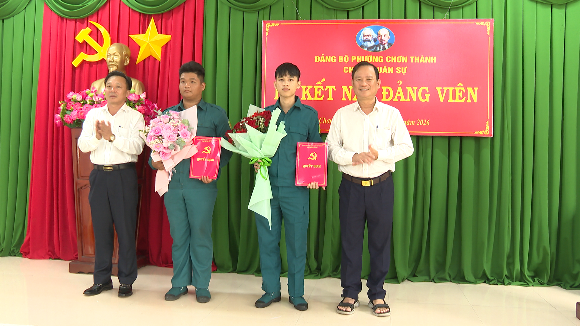 Tại buổi lễ kết nạp, lãnh đạo Chi bộ Ban Chỉ huy quân sự phường Chơn Thành, đã công bố và trao Quyết định của Ban Thường vụ Đảng ủy phường Chơn Thành, về việc kết nạp quần chúng ưu tú Nguyễn Thành Trung, sinh ngày 03/7/2003; Quê quán xã Hương Sơn, tỉnh Hà Tỉnh, vào Đảng Cộng sản Việt Nam và phải trải qua thời gian dự bị 12 tháng tính từ ngày Chi bộ tổ chức kết nạp. Công bố và trao Quyết định của Ban Thường vụ Đảng ủy phường Chơn Thành, về việc kết nạp quần chúng ưu tú Nguyễn Chí Vũ, sinh ngày 09/4/2006; Quê quán phường Bình Dương, thành phố Hồ Chí Minh, vào Đảng Cộng sản Việt Nam và phải trải qua thời gian dự bị 12 tháng tính từ ngày Chi bộ tổ chức kết nạp.