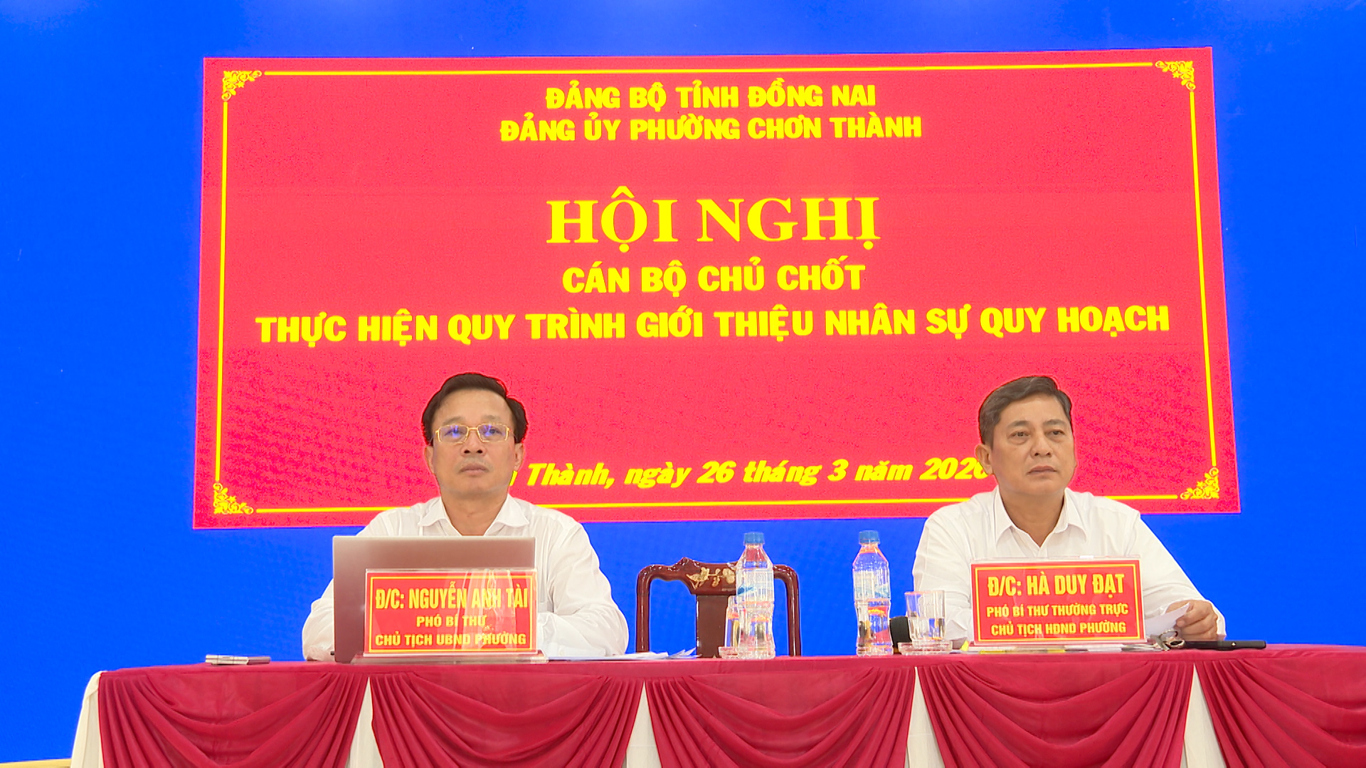 Đồng chí Hà Duy Đạt, Phó Bí thư Thường trực Đảng ủy, Chủ tịch HĐND phường Chơn Thành và đồng chí Nguyễn Anh Tài, Phó Bí thư Đảng ủy, Chủ tịch UBND phường Chơn Thành, chủ trì hội nghị
