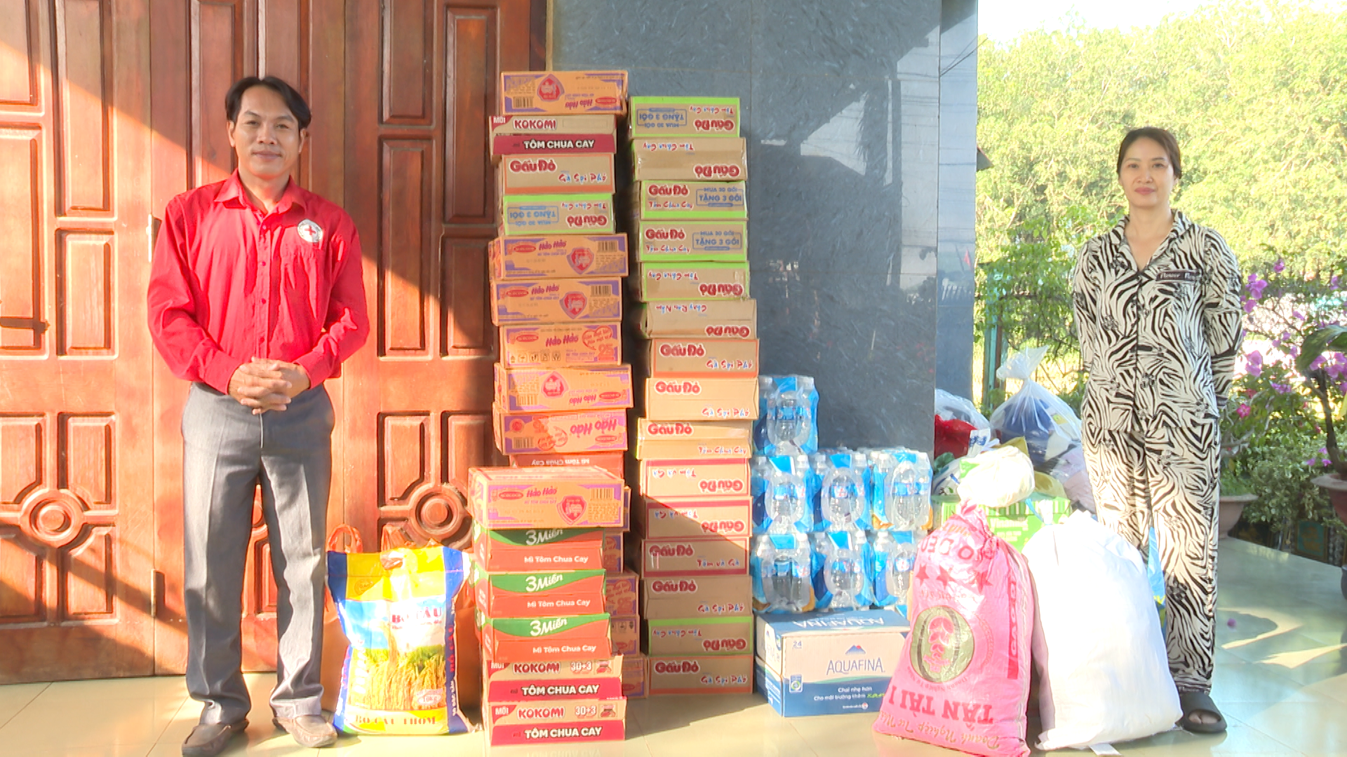 Người dân trao gửi nhu yếu phẩm tại điểm tiếp nhận của Hội chữ thập đỏ phường Chơn Thành