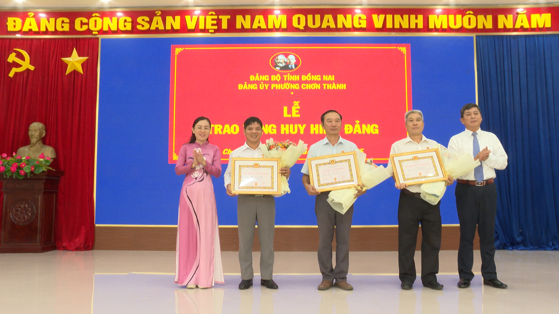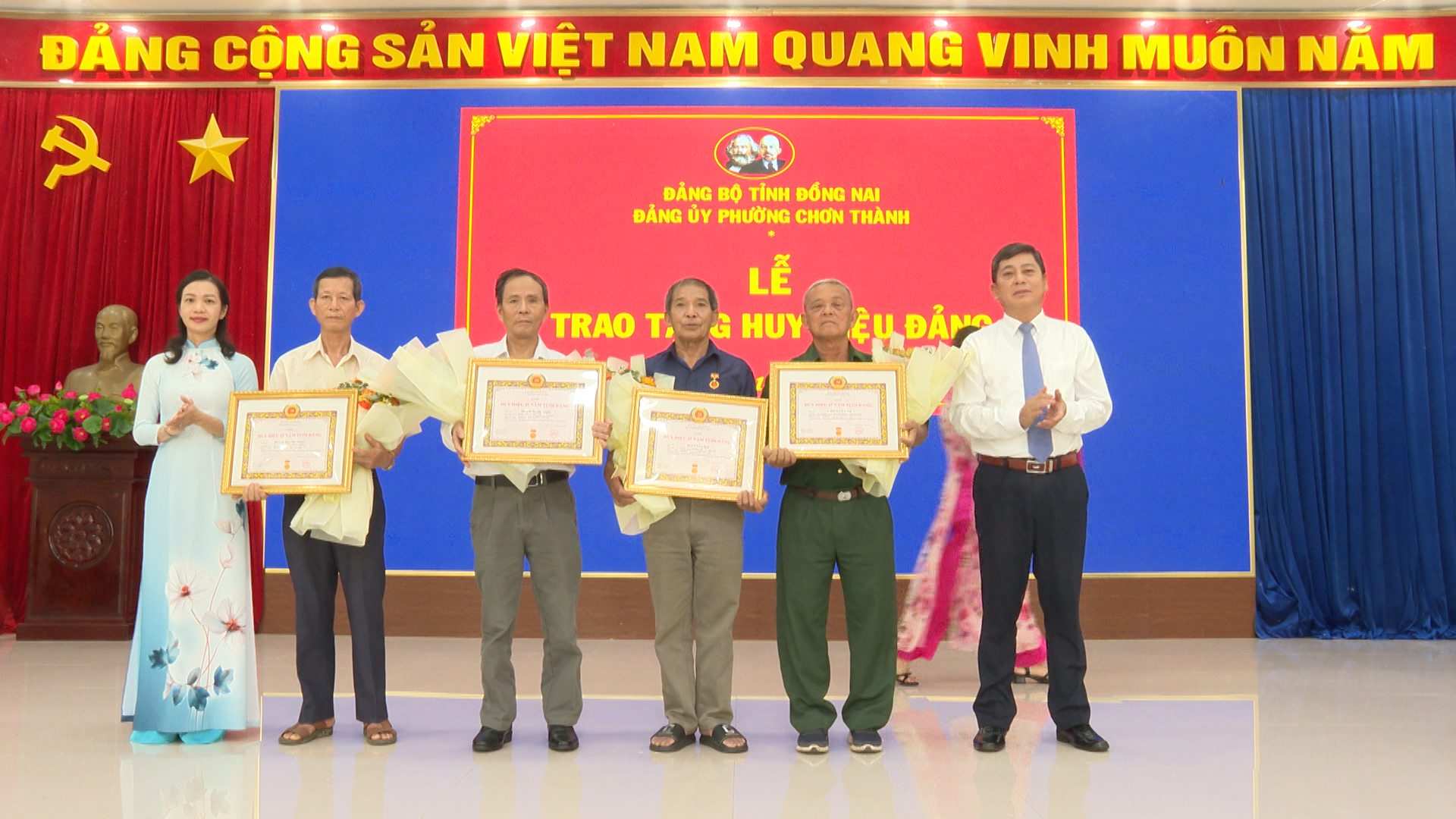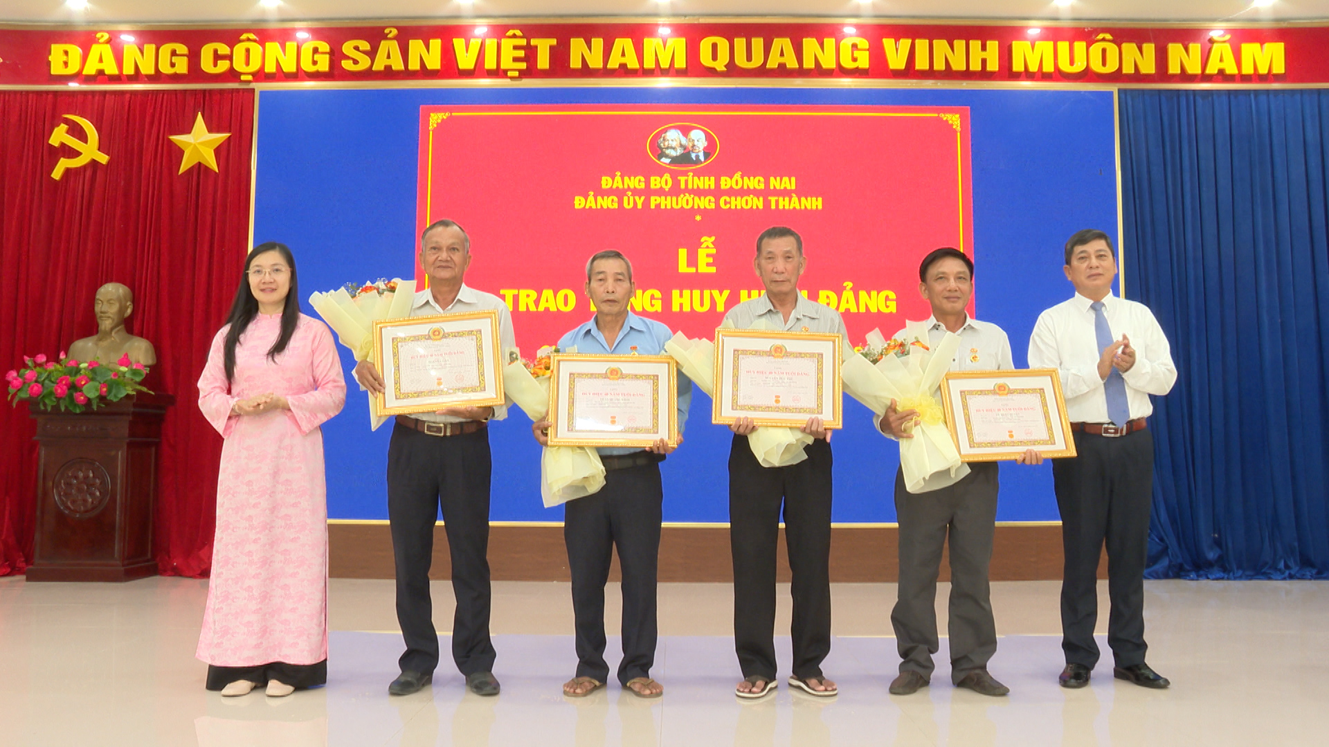 Tại buổi lễ đồng chí Hà Duy Đạt, Phó Bí thư Thường trực Đảng ủy, Chủ tịch HĐND phường Chơn Thành đã lần lượt trao Quyết định của Tỉnh ủy Đồng Nai và gắn Huy hiệu: 55 tuổi Đảng cho đảng viên Trần Đình Phú. Trao Huy hiệu 45 tuổi đảng cho 4 đảng viên: đ/c Phạm Thanh Ngọc, đ/c Bùi Văn Liệp, đ/c Liễu Văn Tám, đ/c Phạm Ngọc Trìu. Trao Huy hiệu 40 năm tuổi đảng cho 4 đảng viên: đ/c Trần Quang Khái, đ/c Nguyễn Đức Thú, đ/c Vũ Xuân Duyệt, đ/c Nguyễn Gần và trao Huy hiệu 30 năm tuổi đảng cho 3 đảng viên: đ/c Lê Xuân Thủy, đ/c Trần Dức Nhâm, đ/c Nguyễn Văn Đài.