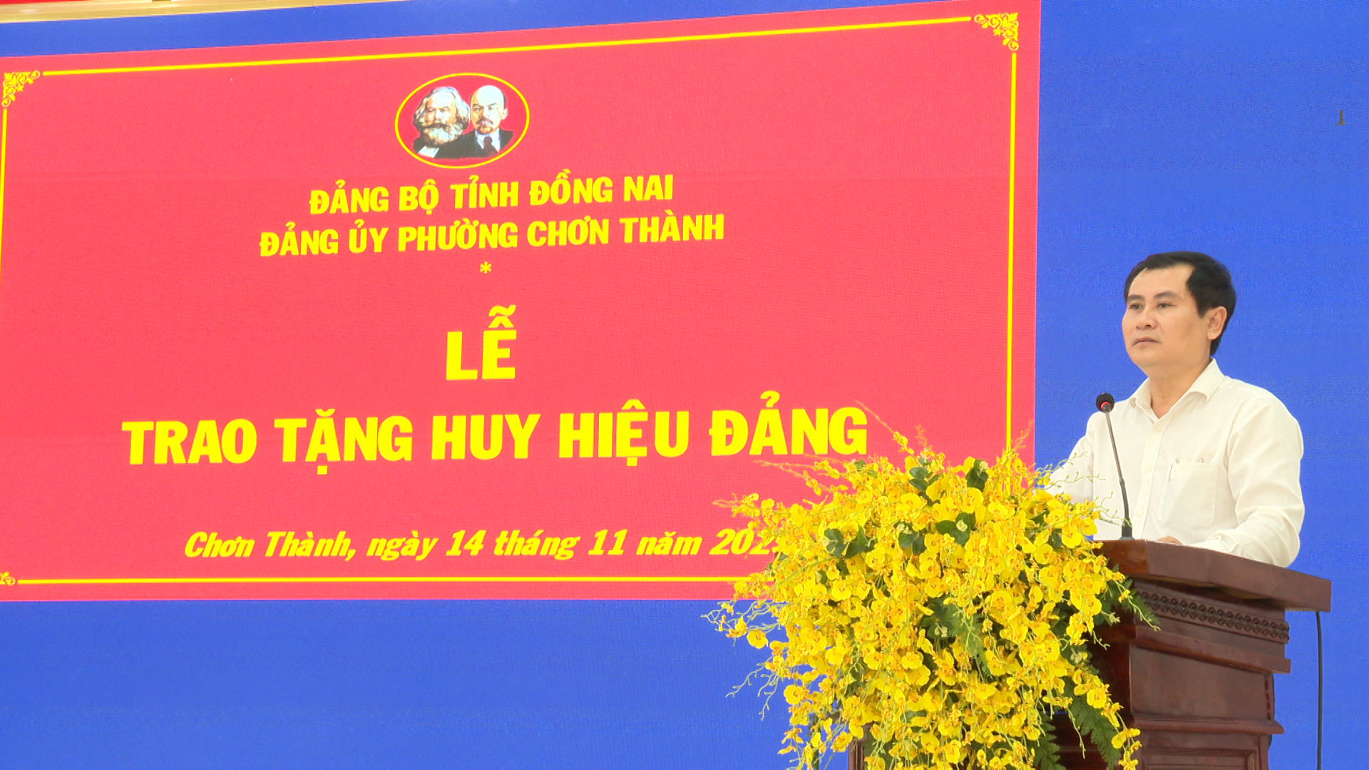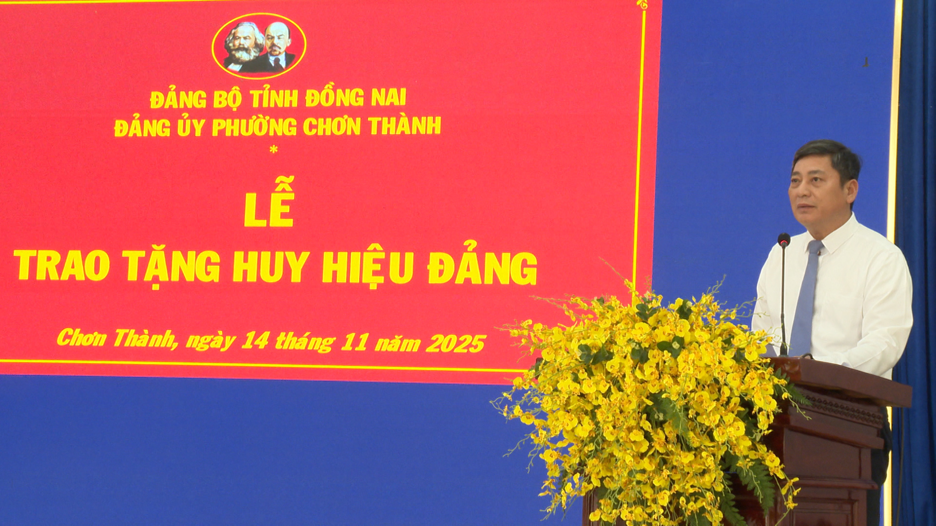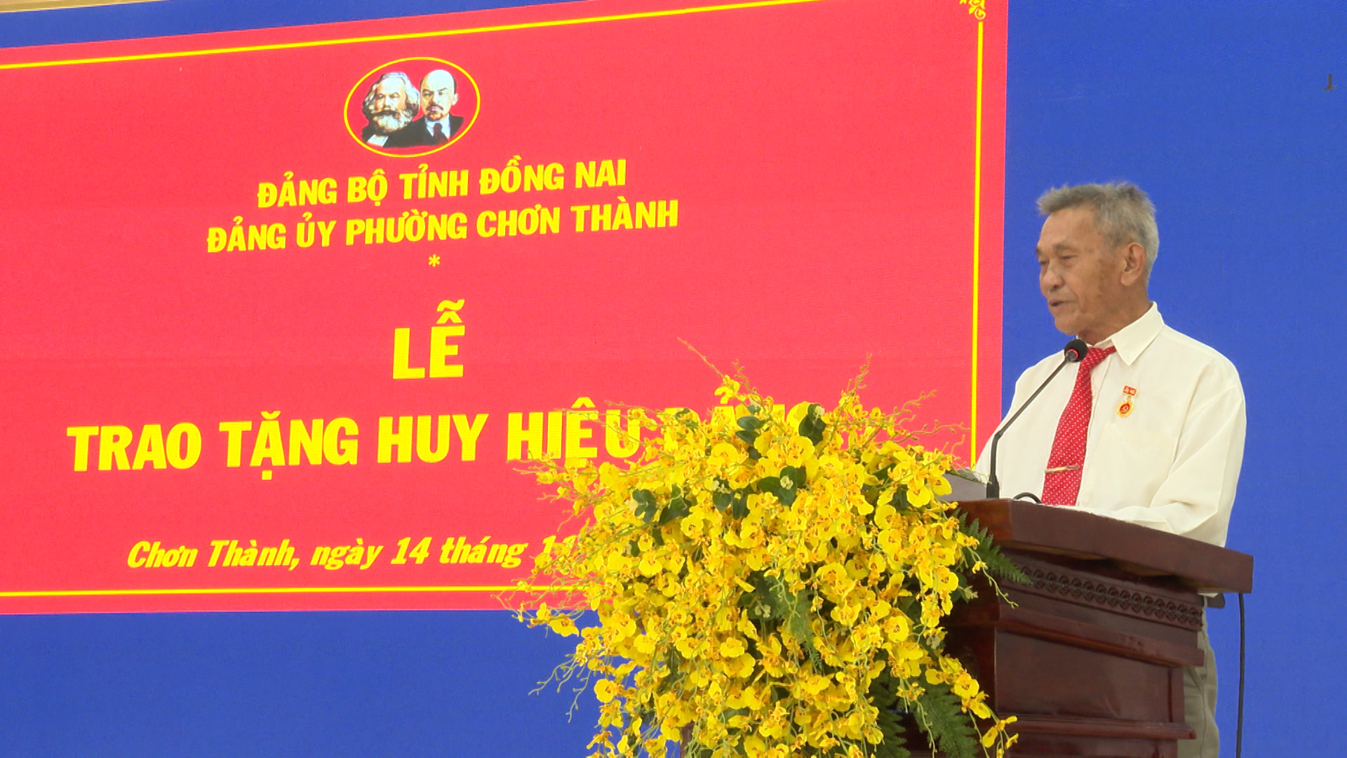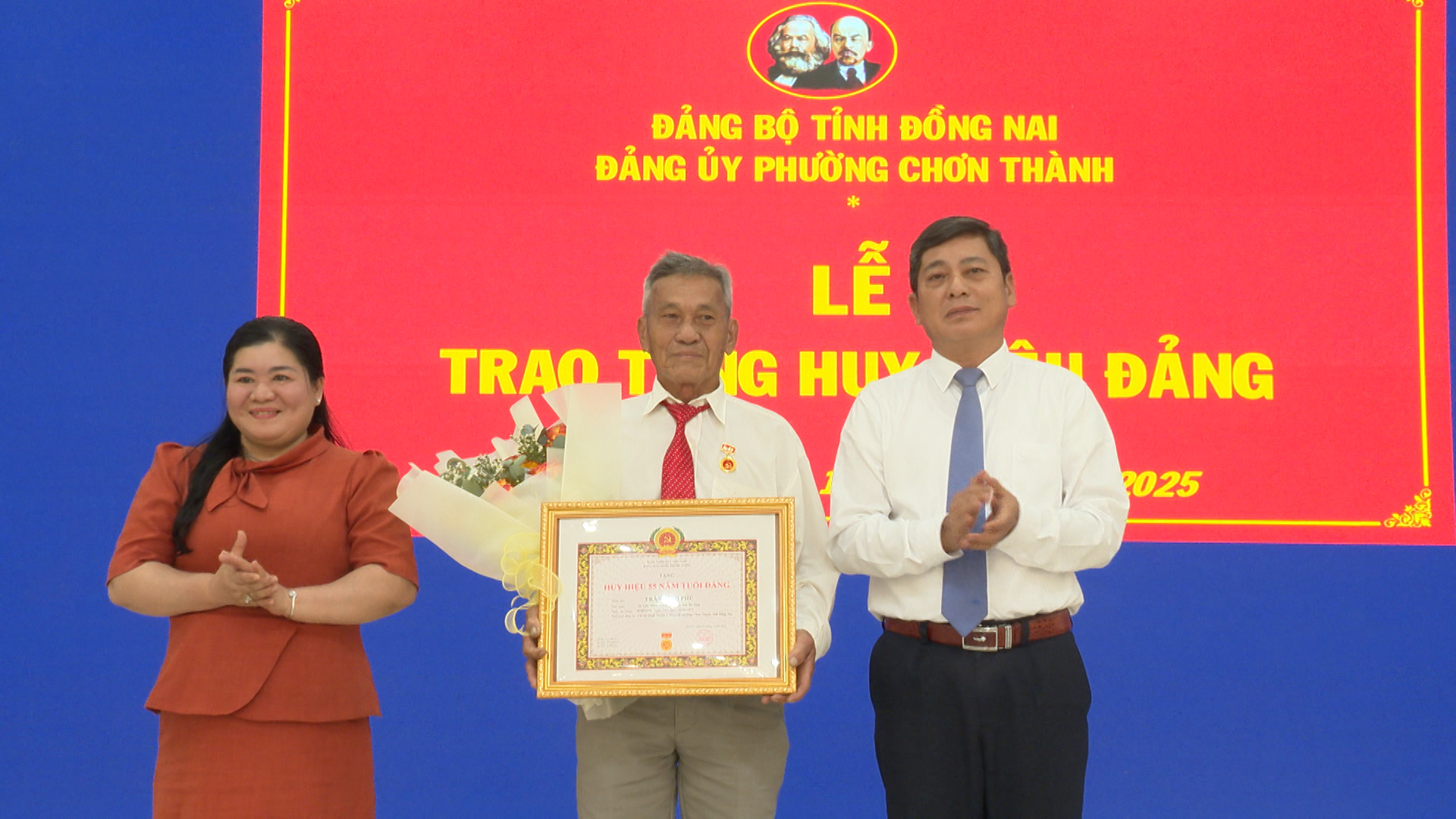 Tại buổi lễ đồng chí Hà Duy Đạt, Phó Bí thư Thường trực Đảng ủy, Chủ tịch HĐND phường Chơn Thành đã lần lượt trao Quyết định của Tỉnh ủy Đồng Nai và gắn Huy hiệu: 55 tuổi Đảng cho đảng viên Trần Đình Phú. Trao Huy hiệu 45 tuổi đảng cho 4 đảng viên: đ/c Phạm Thanh Ngọc, đ/c Bùi Văn Liệp, đ/c Liễu Văn Tám, đ/c Phạm Ngọc Trìu. Trao Huy hiệu 40 năm tuổi đảng cho 4 đảng viên: đ/c Trần Quang Khái, đ/c Nguyễn Đức Thú, đ/c Vũ Xuân Duyệt, đ/c Nguyễn Gần và trao Huy hiệu 30 năm tuổi đảng cho 3 đảng viên: đ/c Lê Xuân Thủy, đ/c Trần Dức Nhâm, đ/c Nguyễn Văn Đài.