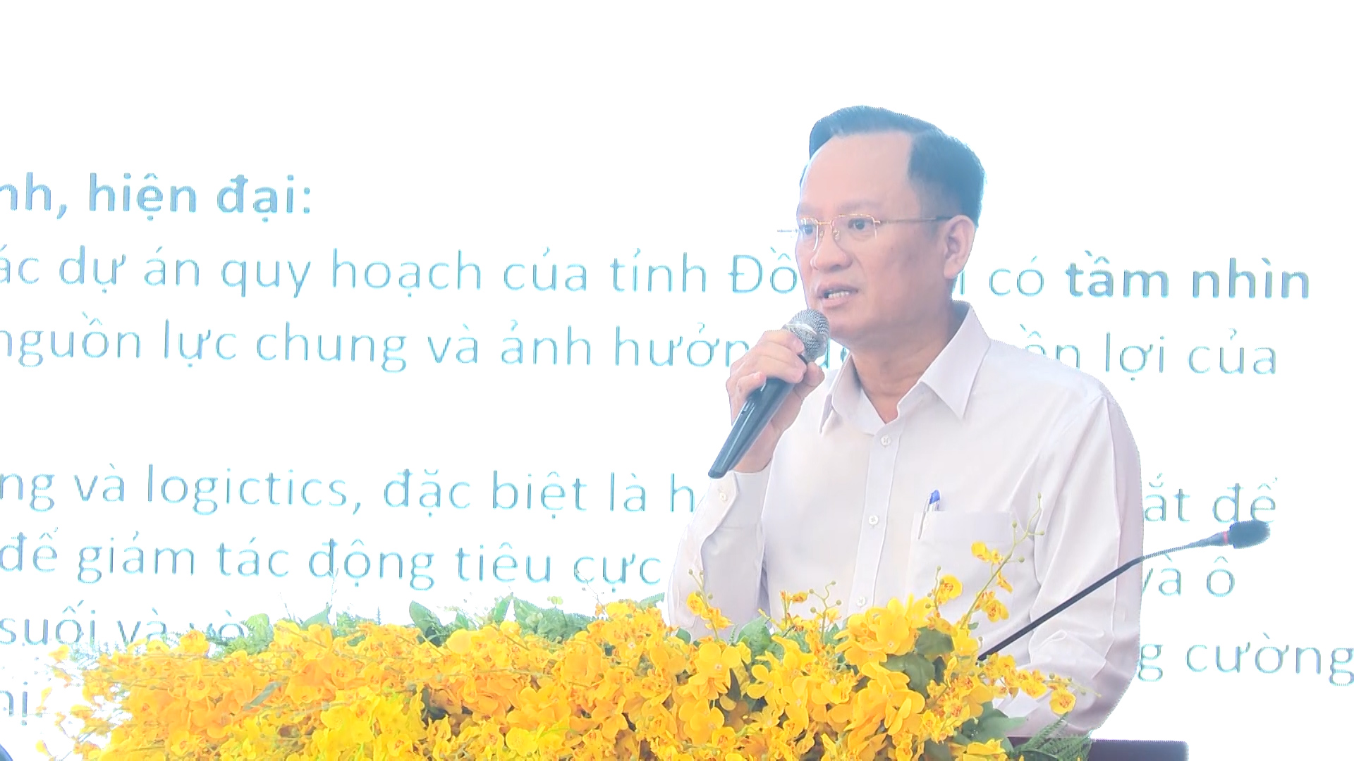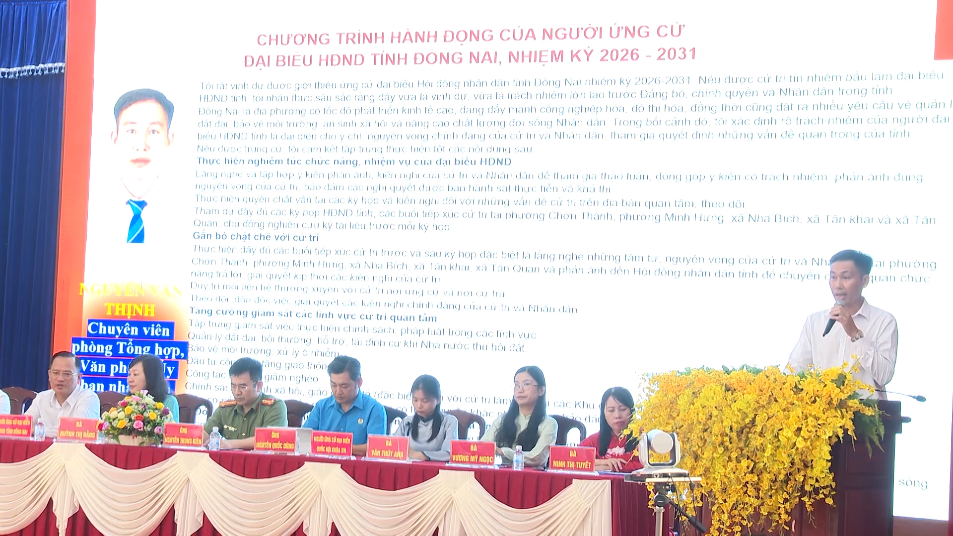 Ông Nguyễn Văn Thịnh, Chuyên viên Phòng tổng hợp, văn phòng UBND tỉnh Đồng Nai, ứng cử viên đại biểu HĐND tỉnh nhiệm kỳ 2026-2031 - Đơn vị bầu cử số 27, trình bày chương trình hành động tại hội nghị