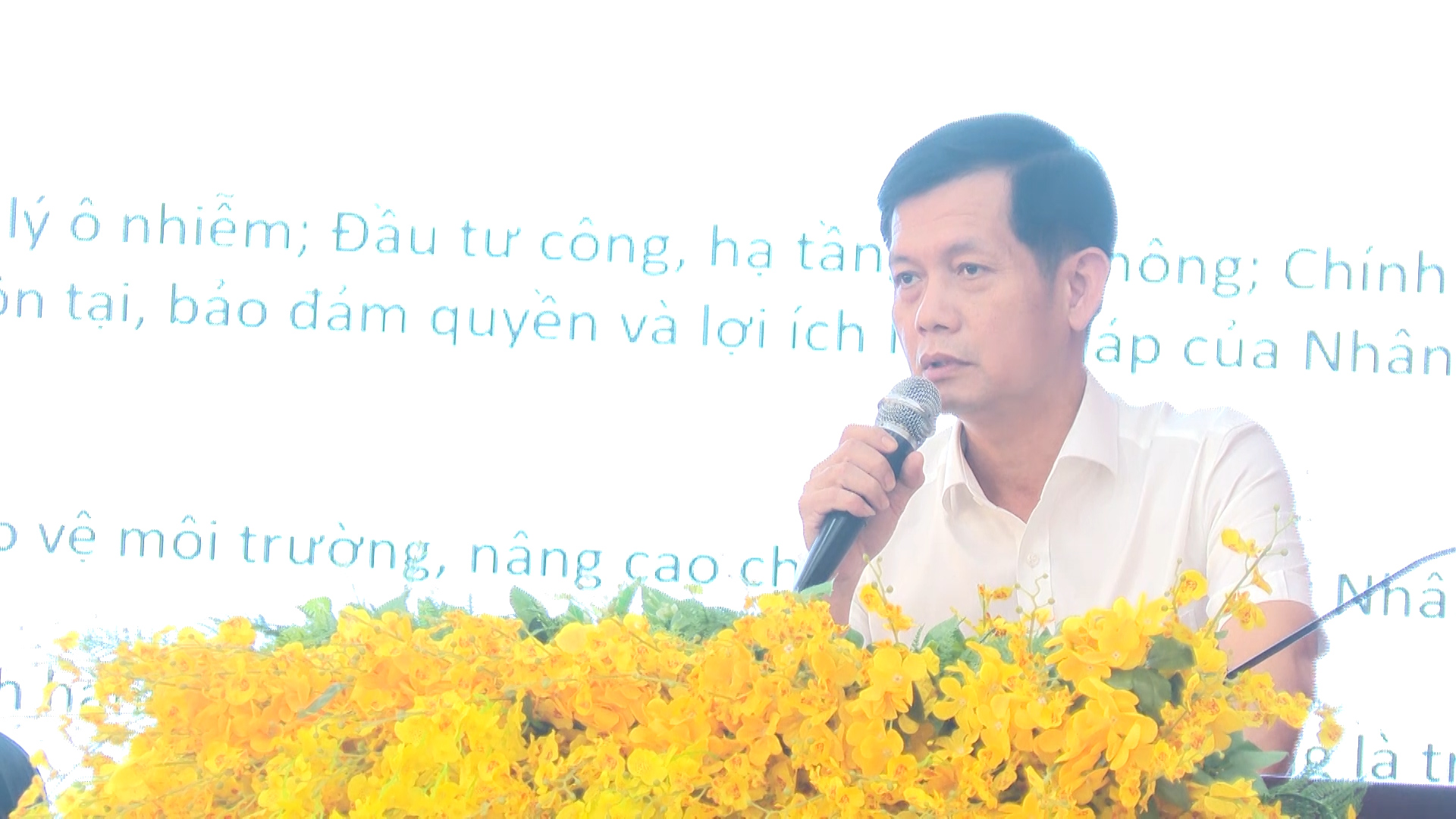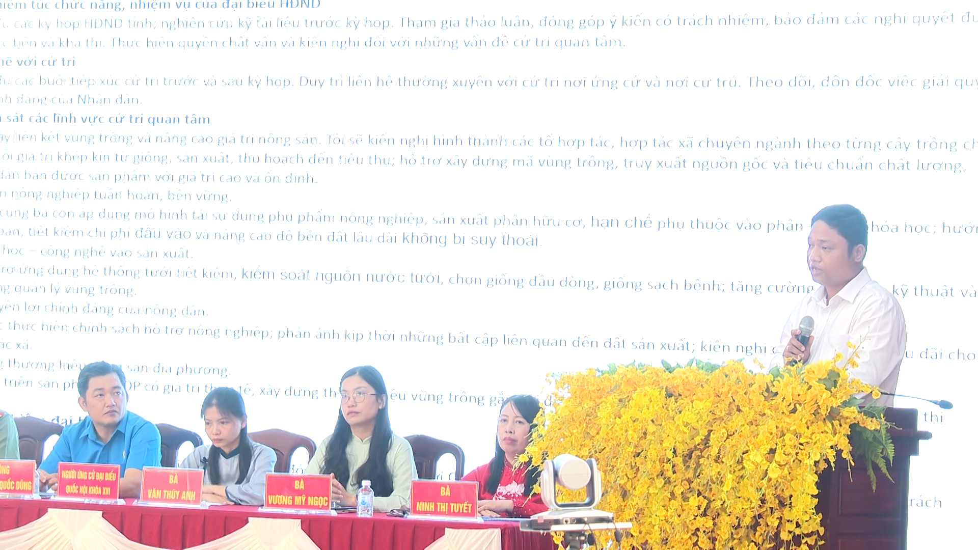 Ông Phạm Minh Trí, Giám đốc Công ty TNHH Thương mại-Dịch vụ Nông nghiệp Tuần Hoàn, ứng cử viên đại biểu HĐND tỉnh nhiệm kỳ 2026-2031 - Đơn vị bầu cử số 27, trình bày chương trình hành động tại hội nghị