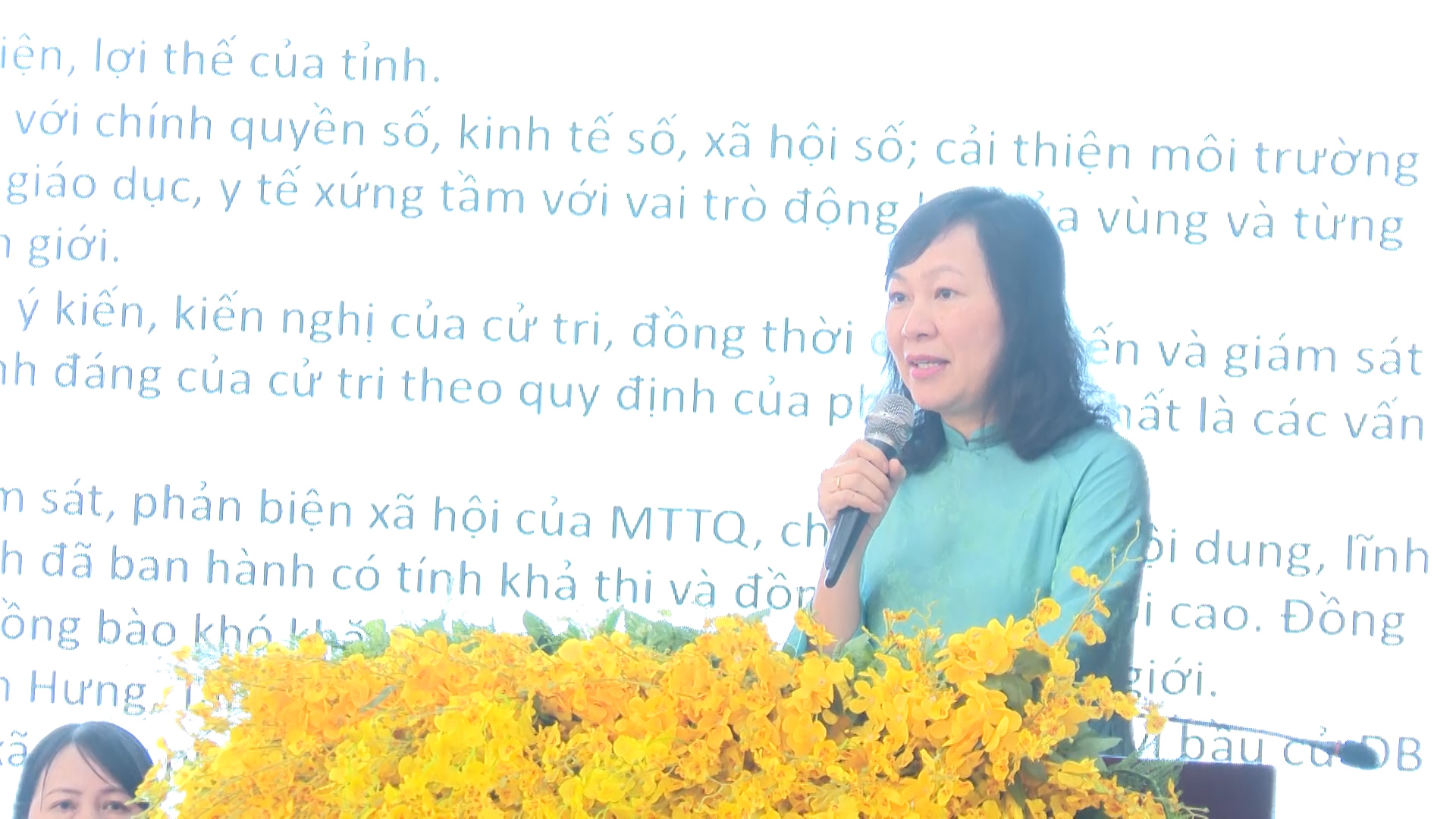 Bà Huỳnh Thị Hằng, Phó Bí thư Tỉnh ủy, Chủ tịch UBMTTQVN tỉnh Đồng Nai, ứng cử viên đại biểu HĐND tỉnh nhiệm kỳ 2026-2031 - Đơn vị bầu cử số 27, trình bày chương trình hành động tại hội nghị