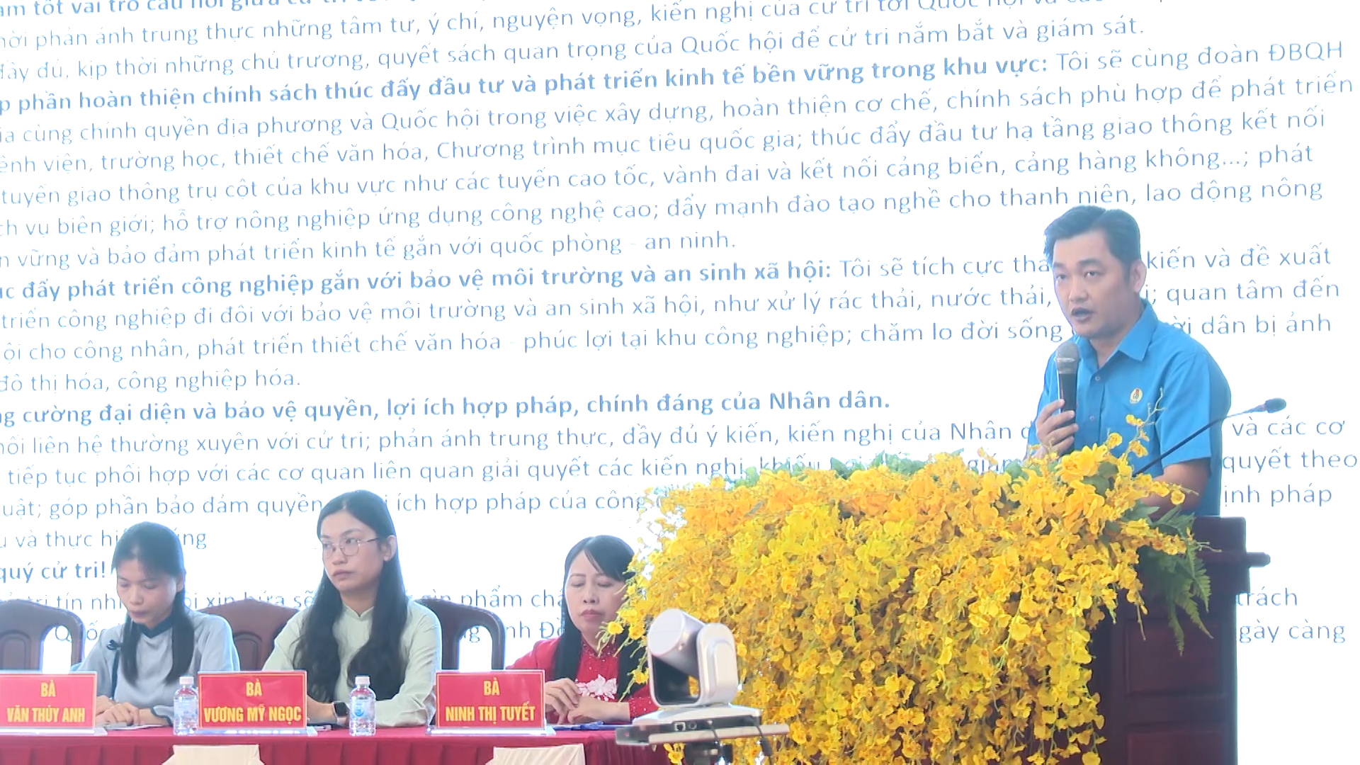 Ông Nguyễn Quốc Dũng, Ủy viên Ban chấp hành Đảng bộ tỉnh, Phó Chủ tịch UBMTTQVN tỉnh, Chủ tịch Liên đoàn Lao động tỉnh Đồng Nai, ứng cử viên đại biểu Quốc hội khóa XVI - Đơn vị bầu cử số 5, trình bày chương trình hành động tại hội nghị