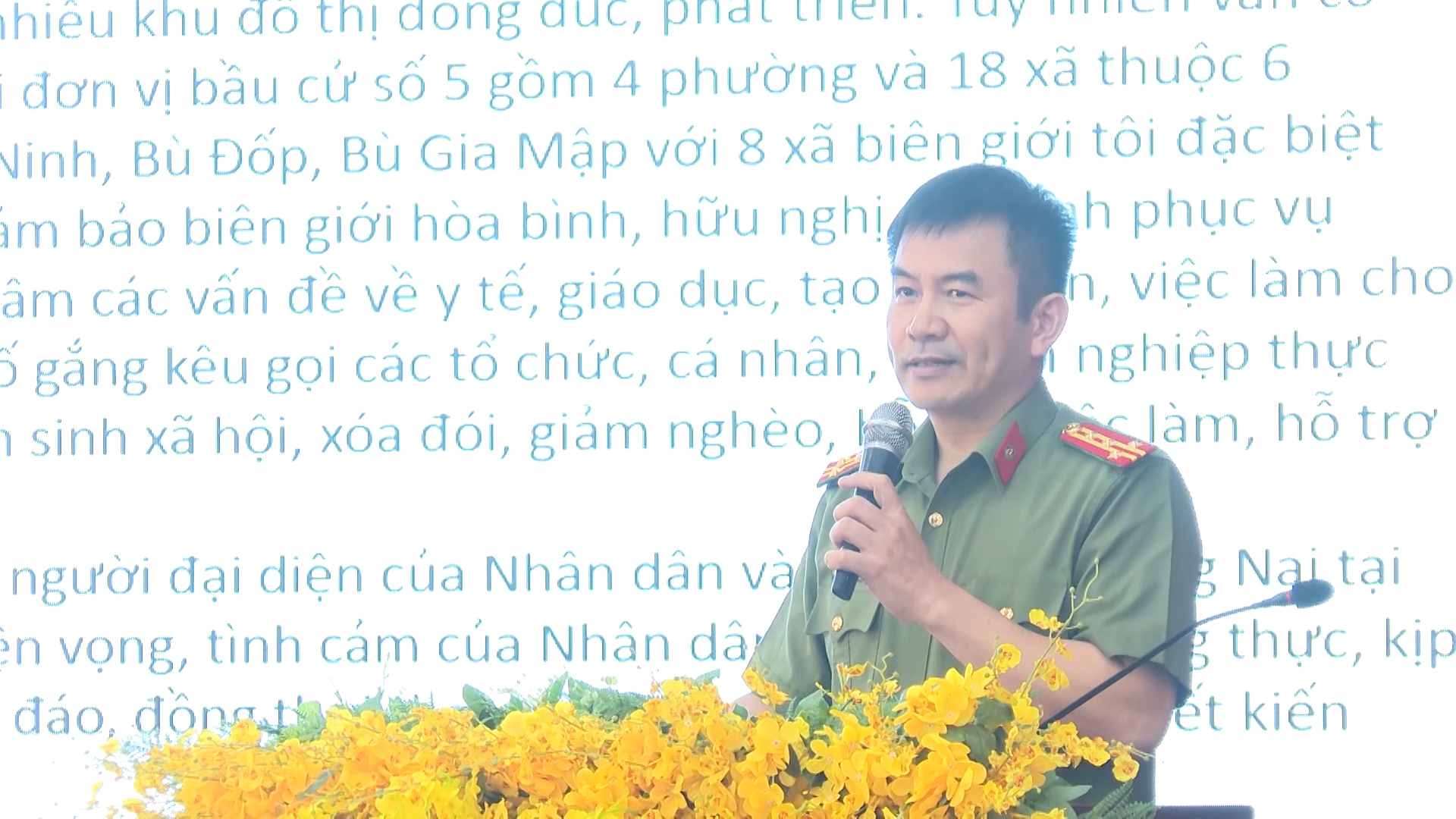 Ông Đặng Văn Dũng, thành viên Hội đồng quản trị, Tổng Giám đốc Công ty cổ phần phát triển hạ tầng kỹ thuật Becamex - Bình Phước, ứng cử viên đại biểu HĐND tỉnh nhiệm kỳ 2026-2031 - Đơn vị bầu cử số 27, trình bày chương trình hành động tại hội nghị