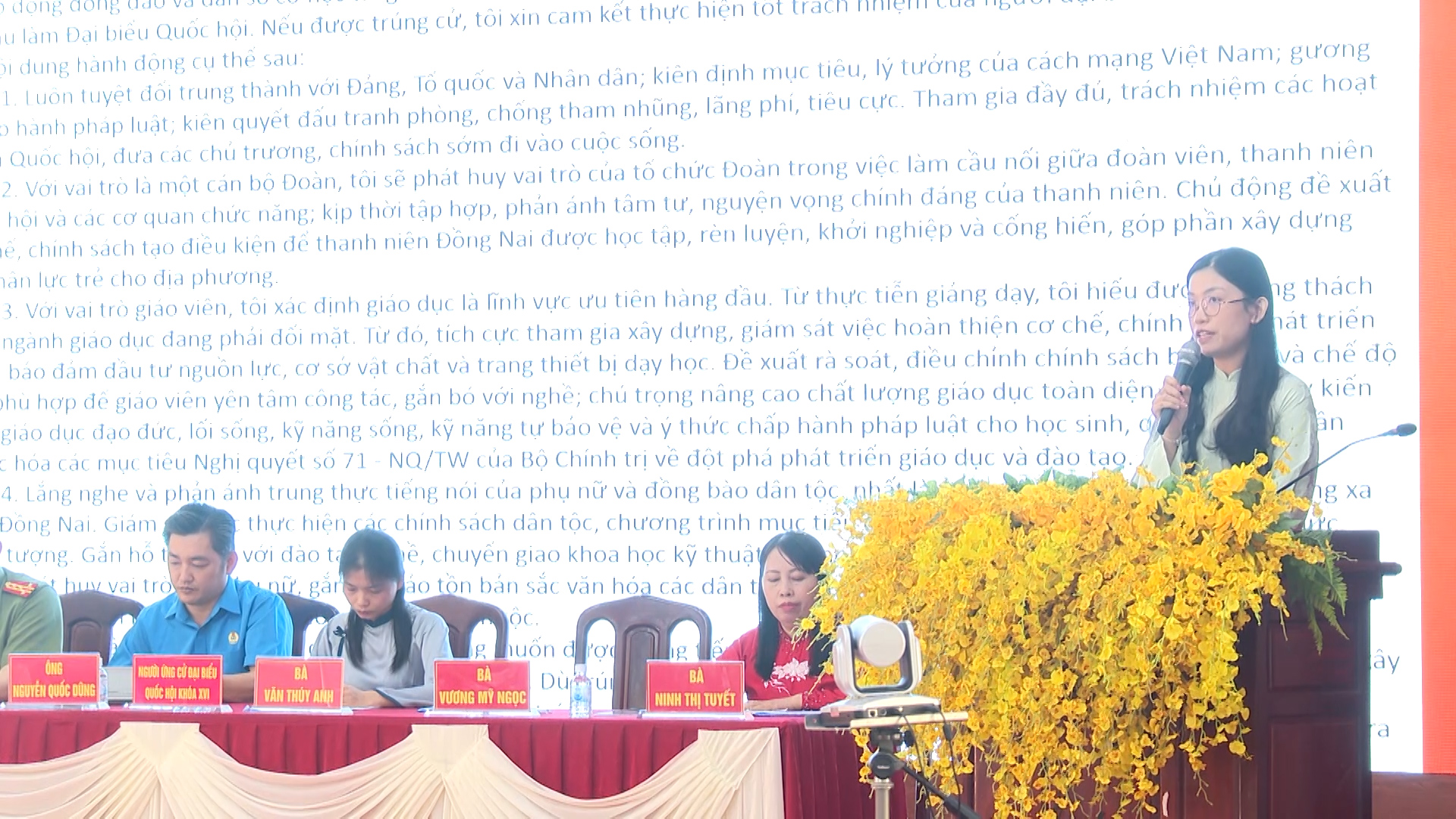 Bà Vương Mỹ Ngọc, Phó Bí thư Đoàn trường, giáo viên sinh học Trường phổ thông thực hành sư phạm tỉnh Đồng Nai, ứng cử viên đại biểu Quốc hội khóa XVI - Đơn vị bầu cử số 5, trình bày chương trình hành động tại hội nghị