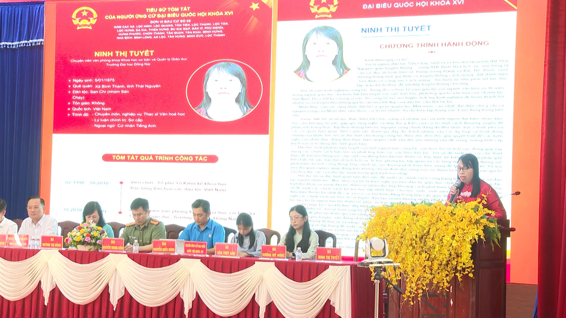 Bà Ninh Thị Tuyết, Chuyên viên Văn phòng Khoa học cơ bản và Quản lý giáo dục, Trường đại học Đồng Nai, ứng cử viên đại biểu Quốc hội khóa XVI - Đơn vị bầu cử số 5, trình bày chương trình hành động tại hội nghị
