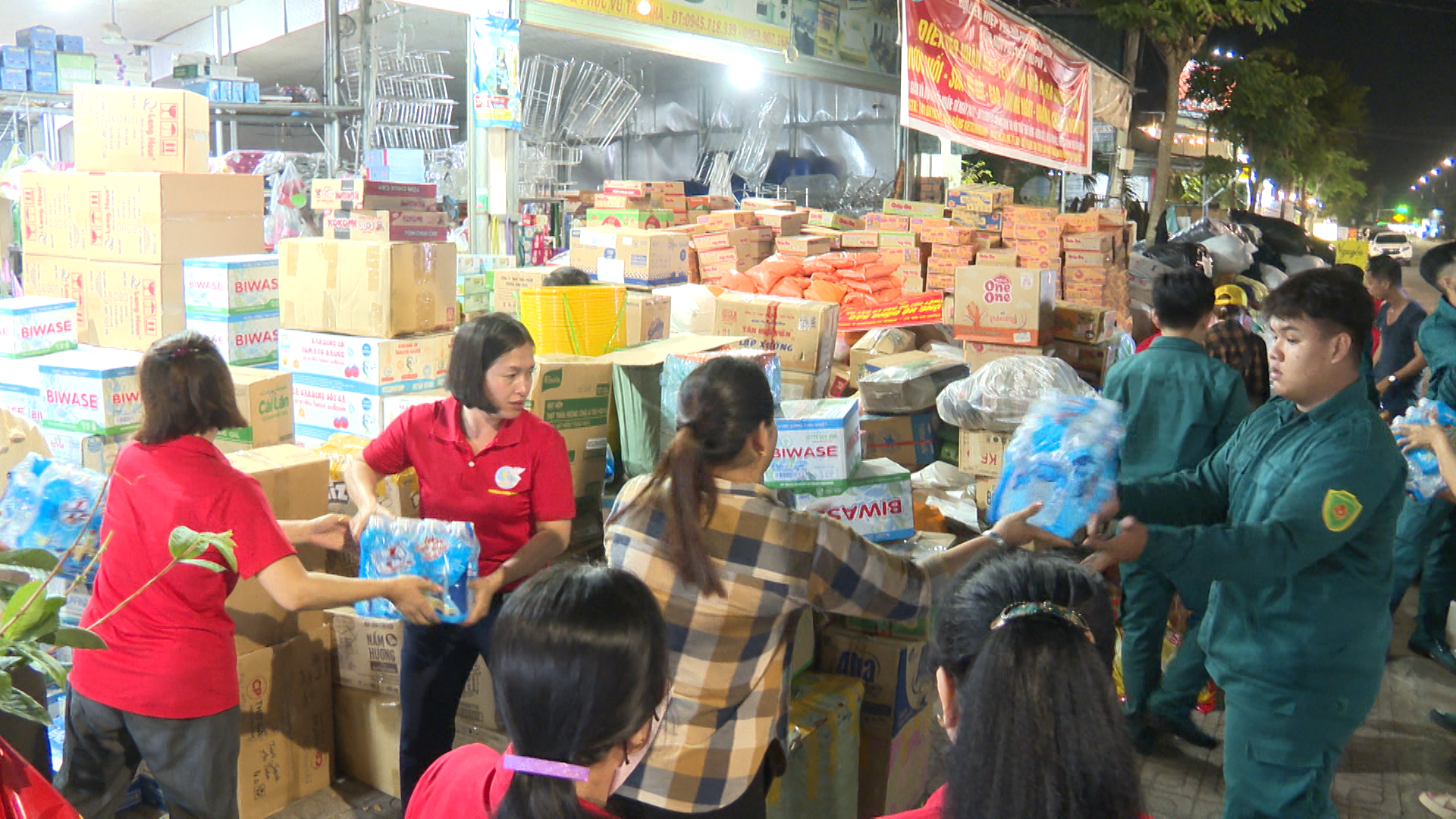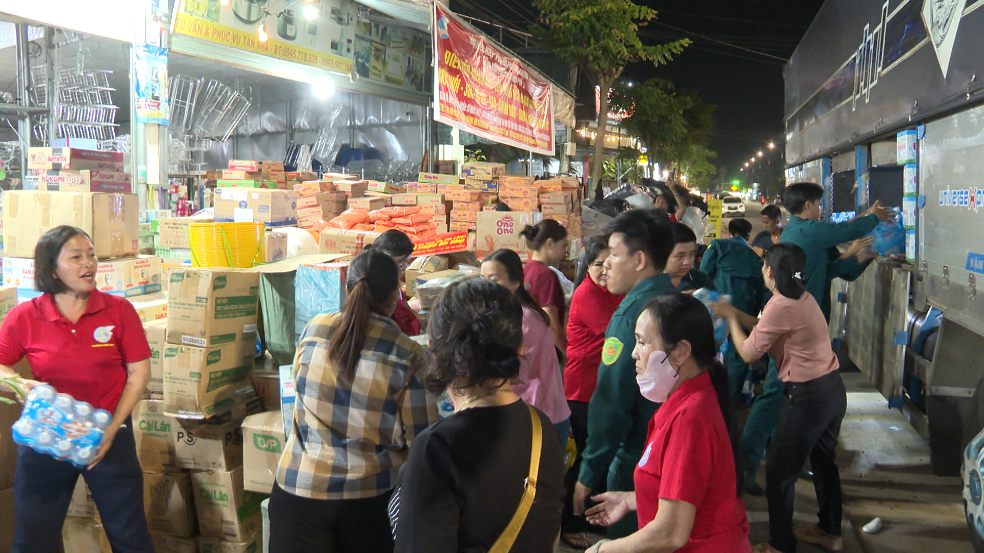 Các hội, đoàn thể và nhân dân tham gia vận chuyển nhu yếu phẩm lên xe để xuất quân chuyến hàng cứu trợ ủng hộ đồng bào miền Trung bị thiệt hại do mưa lũ