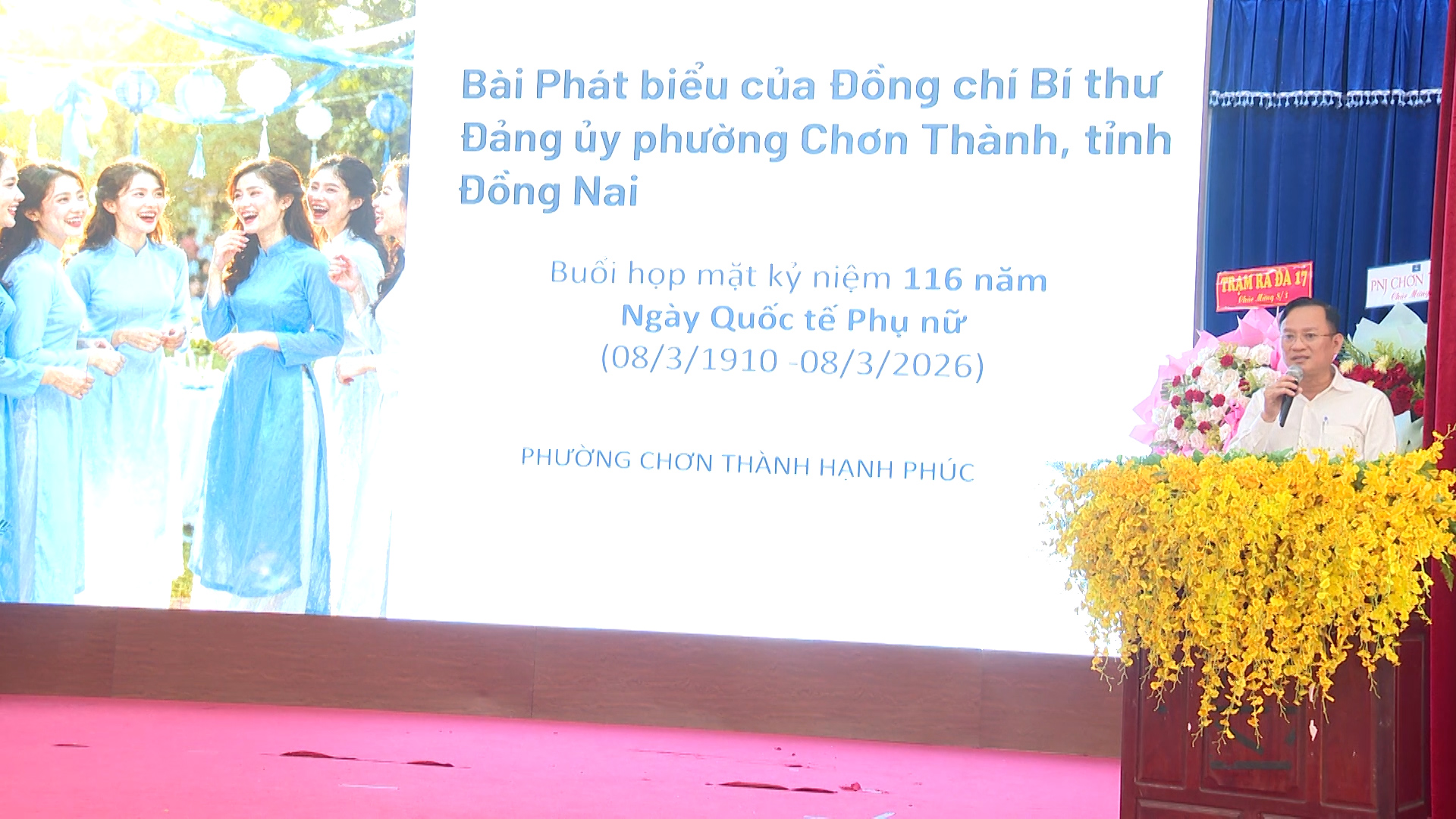 Hôm nay, trong không khí vui tươi, phấn khởi và đầy ý nghĩa của tháng Ba, Đảng ủy, HĐND, UBND, Ủy ban MTTQ Việt Nam phường Chơn Thành tổ chức họp mặt kỷ niệm 116 năm Ngày Quốc tế Phụ nữ 8/3. Thay mặt Ban Thường vụ Đảng ủy phường, tôi xin gửi đến các đồng chí lãnh đạo, quý đại biểu cùng toàn thể cán bộ, hội viên và chị em phụ nữ lời chúc mừng nồng nhiệt nhất; kính chúc các bà, các mẹ, các chị, các em luôn mạnh khỏe, hạnh phúc, thành công trong công tác, lao động, học tập và cuộc sống.
